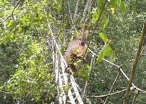 消防ホース製の吊り橋を渡るオランウータン (写真提供:ボルネオ保全トラストジャパン)