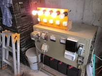さて、その発電出力は、常時500W、最大800W。200V三相誘導発電機で発電した電気を、直流30V未満に変換しバッテリーに蓄電した後、インバーターで100Vに昇圧します。この電気制御機もNPO法人やすらぎの里いとしろの理事長による手作り。生み出された電気は農水路に近接したNPO法人の事務所の照明や冷蔵庫の動力源となっています。