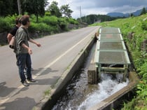 らせん型水車の大きな特徴はごみがつまりにくいことと、流量さえあれば落差が低くても発電できる事です。今回の農水路も流量0.2㎥/秒、落差80cm程度です。メンテナンスはらせん軸のグリスアップ程度で充分らしく電気制御機もバッテリーの定期メンテくらいなもので、地元の人たちのみで管理をしています。