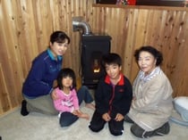 温かなぬくもりを感じさせる木の仮設住宅に、ぴったりのストーブがやってきて、住んでいる人たちにも笑顔が広がっている。