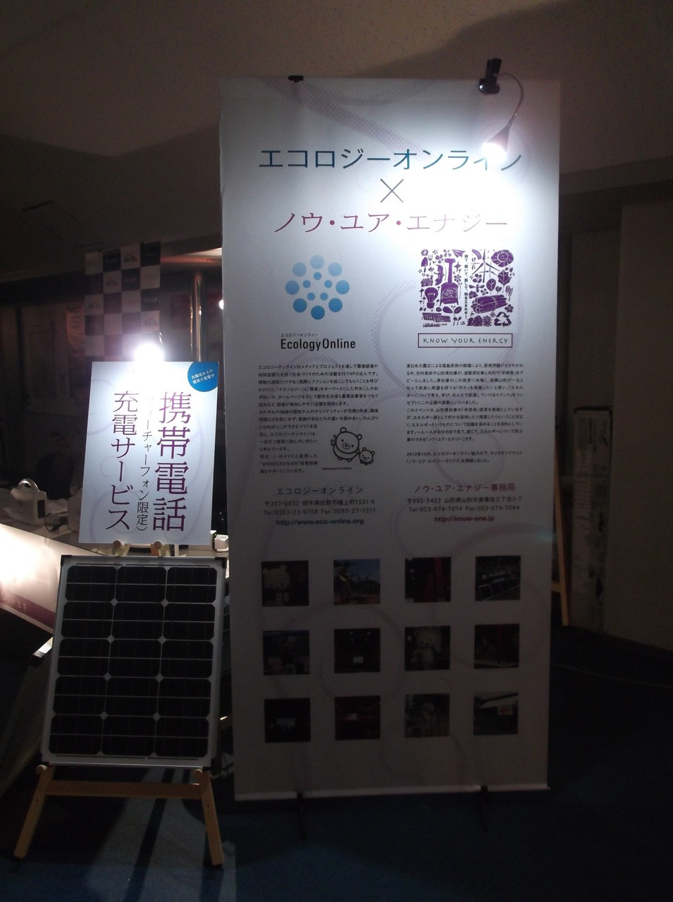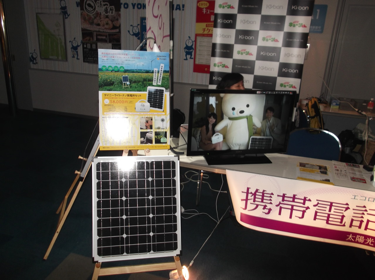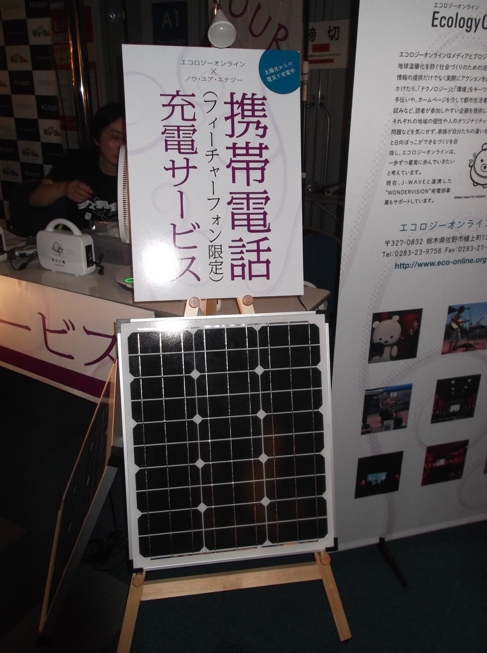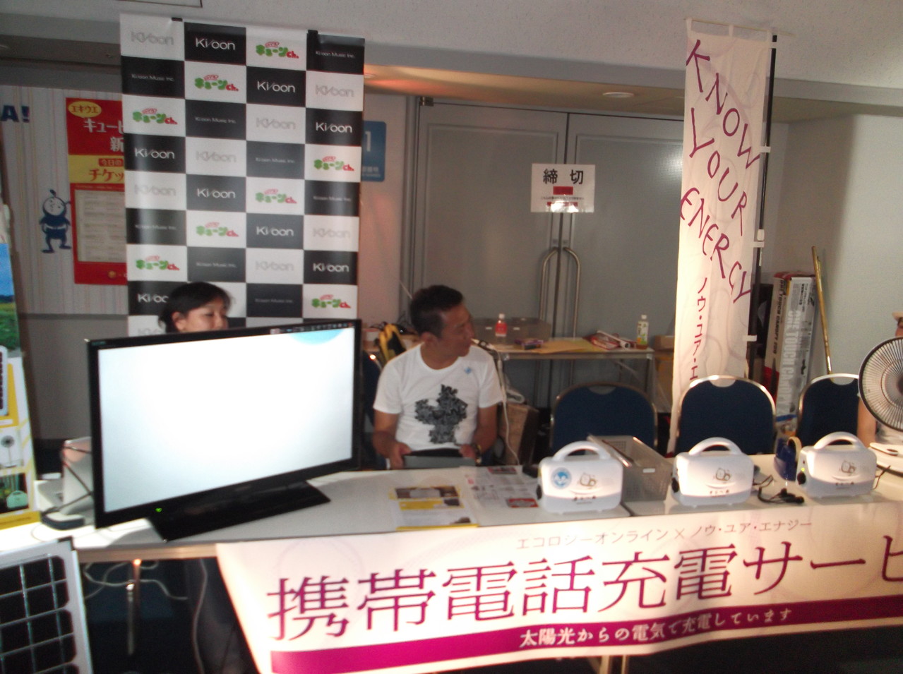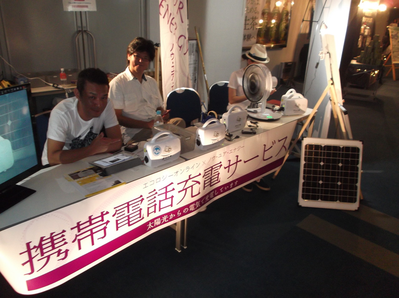 このブースは石野卓球さんが所属するレーベル株式会社キューンミュージックの環境向けの社会貢献活動として無償提供されたもの。レーベルのみなさんとともにエコロジーオンラインのスタッフが出迎えます。携帯、スマフォ、タブレットPC、オーディオ等々、身近な電気は自分でつくれる時代がやってきたことをぜひともご体感ください。