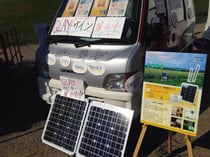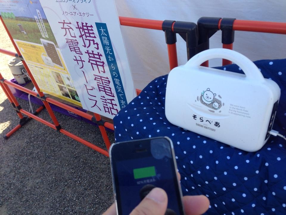 このサービスの現場をサポートしてくれたのは現在、NPO申請中のエコふくしま音楽と未来のみなさん。福島の太陽でお腹いっぱいにした3台ナノ発電所で50人の携帯電話を充電することができました。