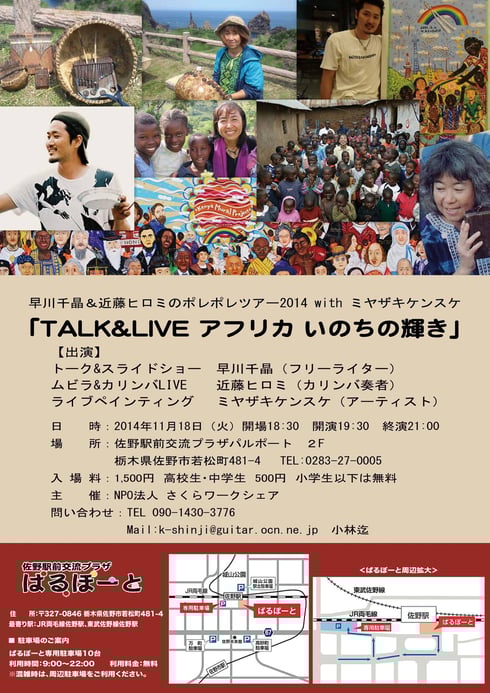 また親指ピアノの第一人者である音楽家・近藤ヒロミさんの親指ピアノの演奏をお楽しみ下さい。今回は特別ゲストとして、ケニア壁画プロジェクトの活動を行なっているミヤザキケンスケさんにお越しいただきライブペインティングをしていただきます。