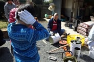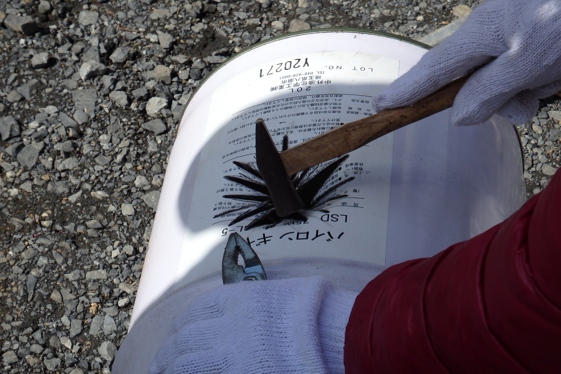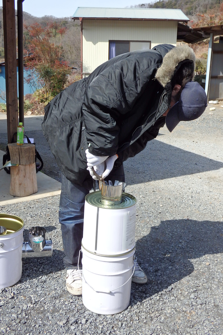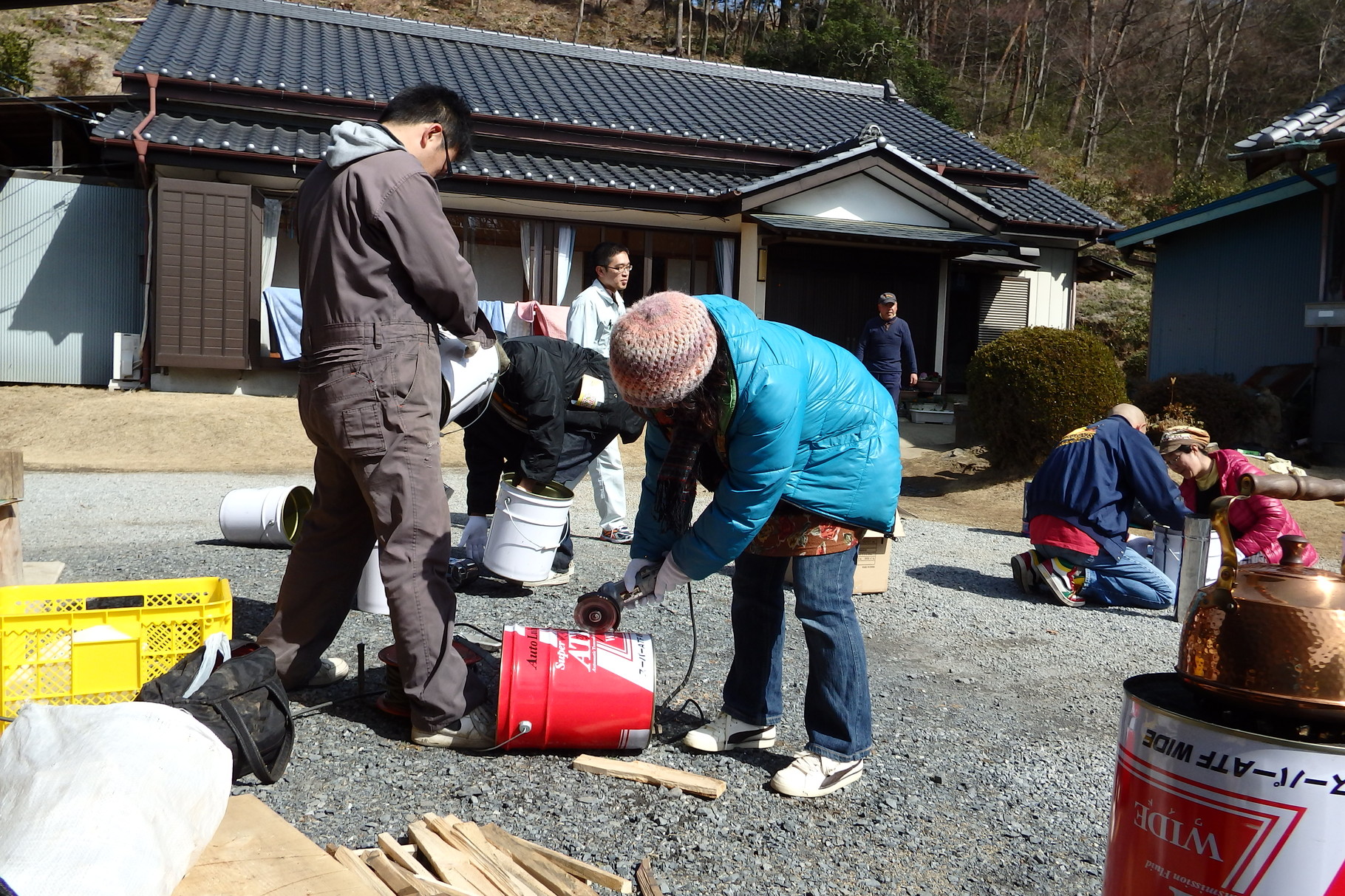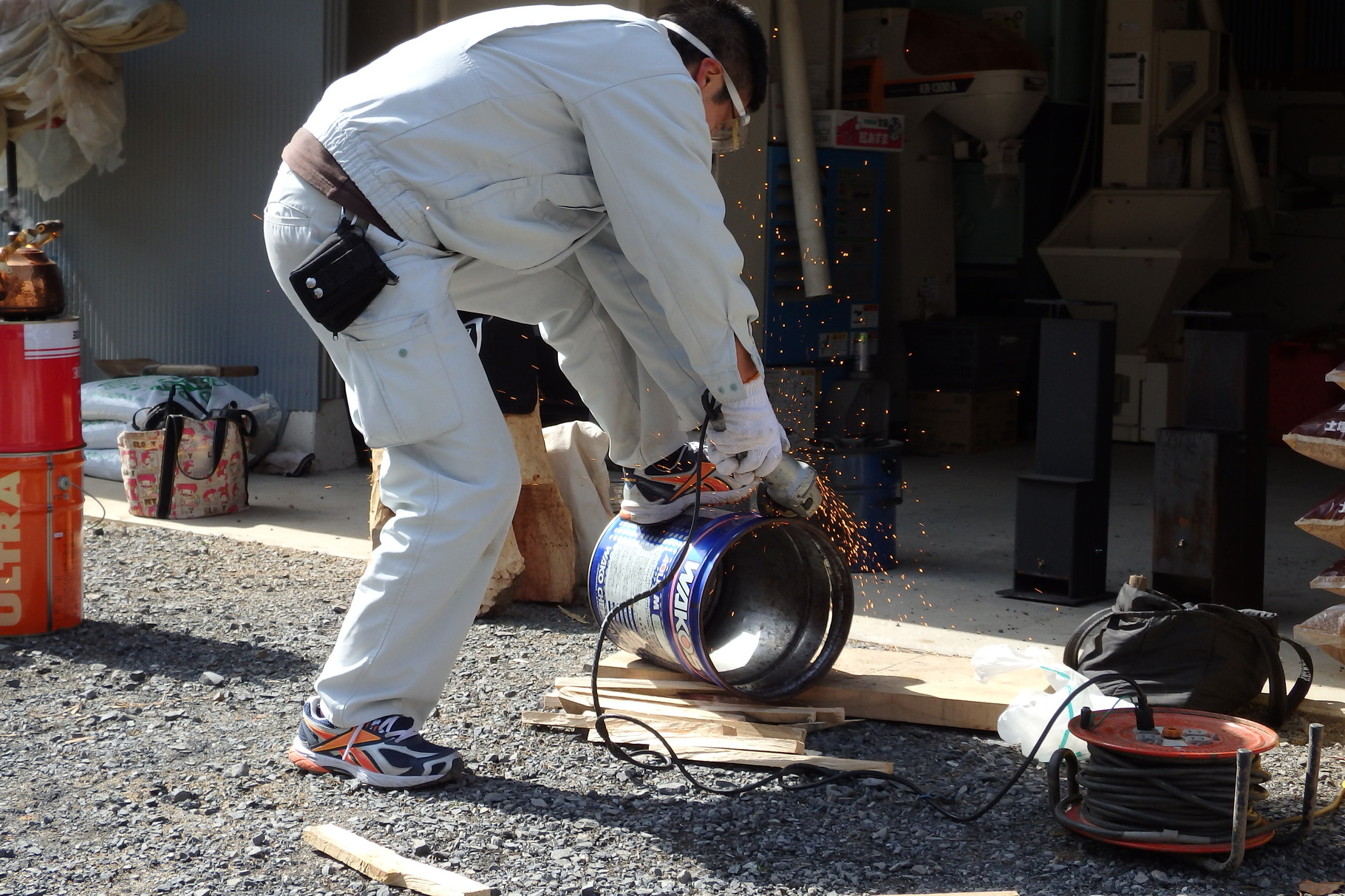初めに下になるペール缶にT管&エビ管を通す穴を作るのですが、円形を放射線状にサンダー(金属を切る工具)で切ります。音と火花がすごくて、体験希望だった少年は耳を抑えて去っていきました^^;そんな中女性の参加者も果敢にチャレンジ。いやはや尊敬です。