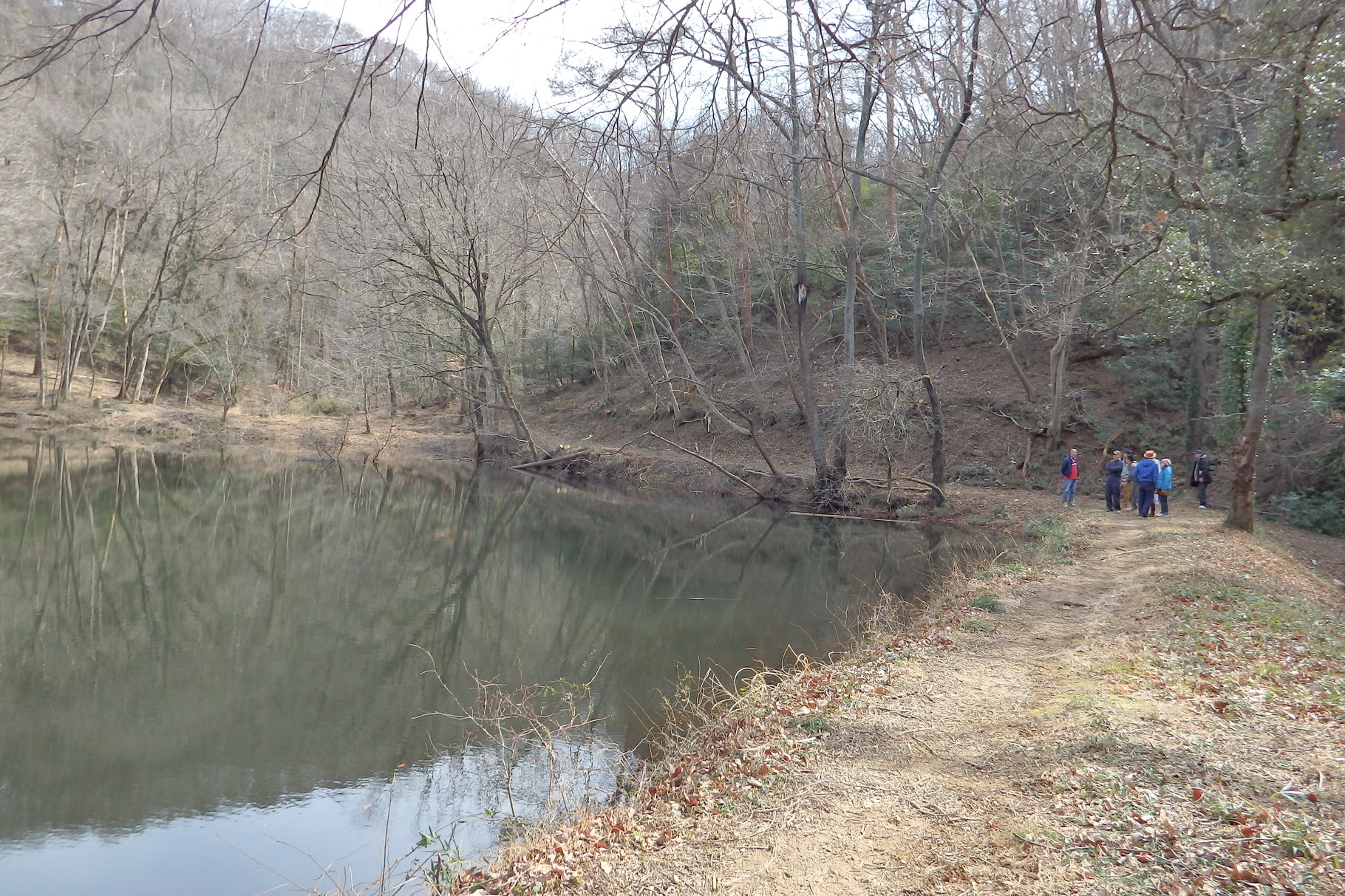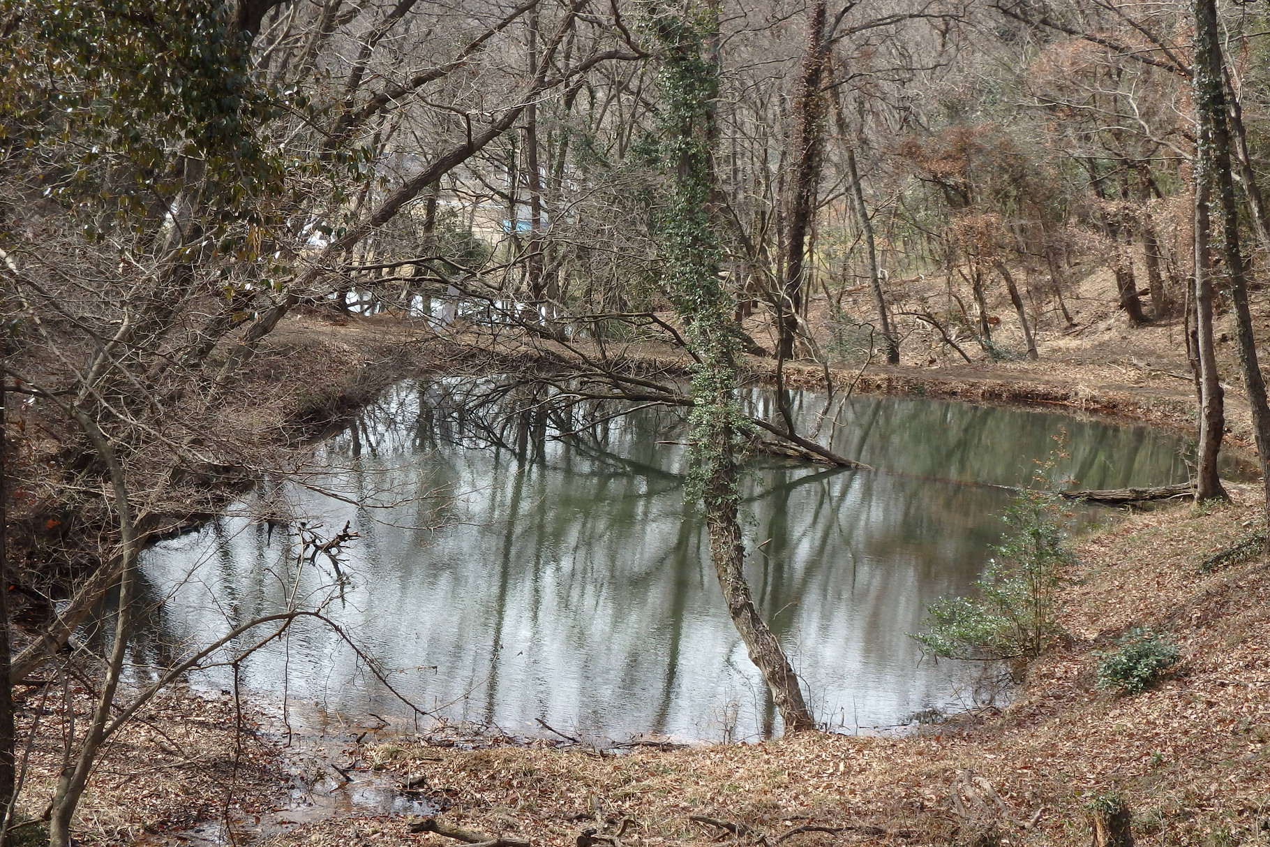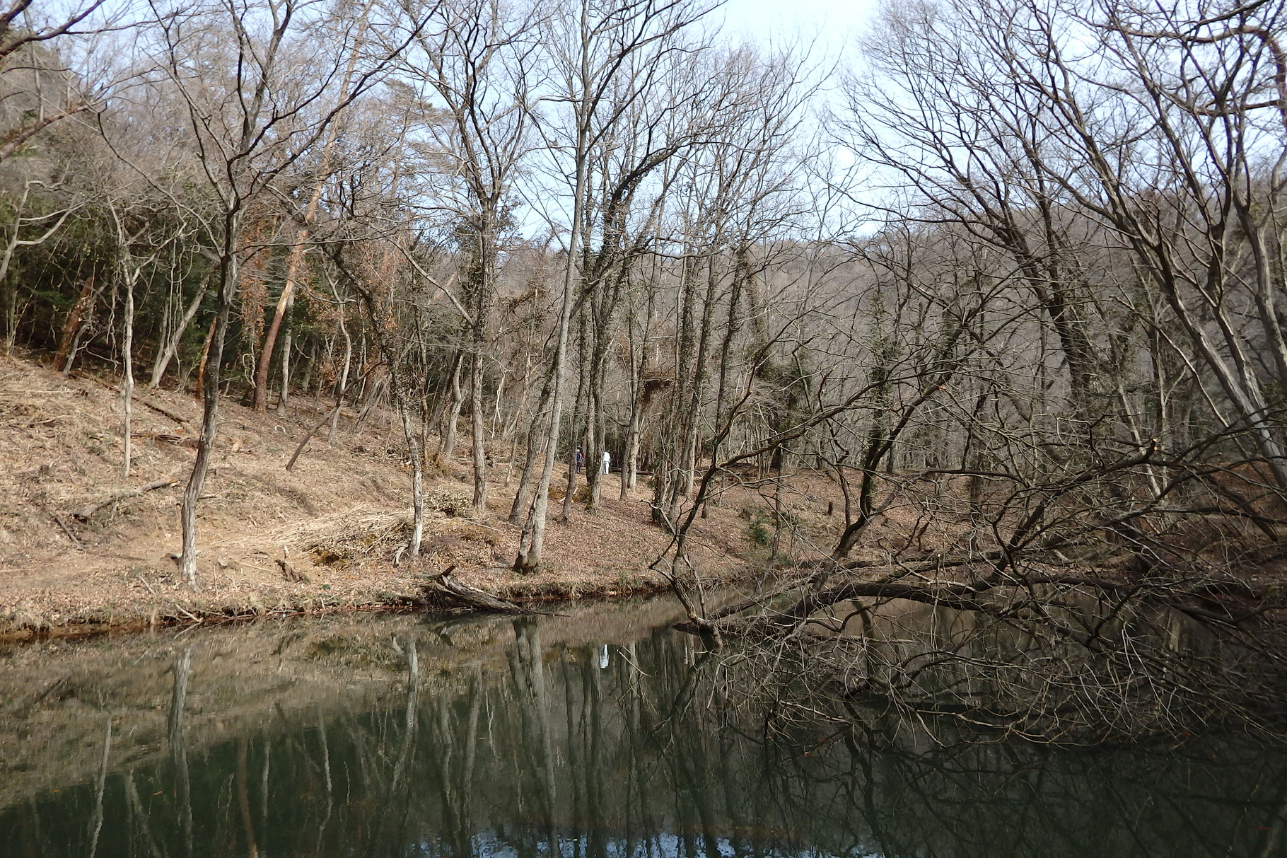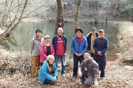 立派な山桜を眺めながら、春に予定している「ロケットストーブ持ち寄りお花見大会」に思いを馳せ、ため池をバックに記念写真。