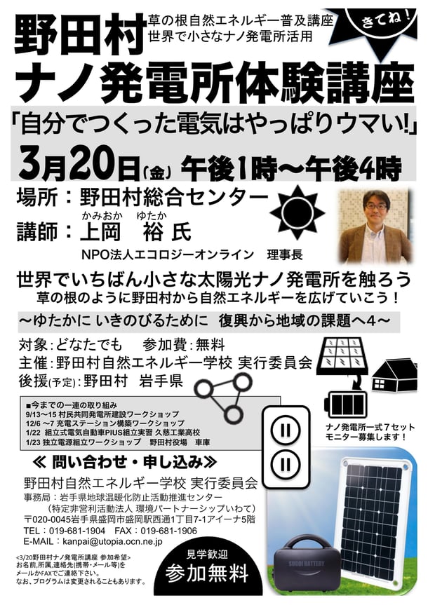 3月20日、野田村自然エネルギー学校実行委員会からの要請を受け、岩手県野田村総合センターにてナノ発電所体験講座を実施します。野田村はだらすこ市民共同発電所があることで有名な地域。ナノ発電所を購入し、みんなで有効活用し、足もとから自然エネルギーを広めて行こうという取り組みです。EOL発電部としてもこうした地域の取り組みをどんどん応援して行こうと思ってます。よろしくお願いします!