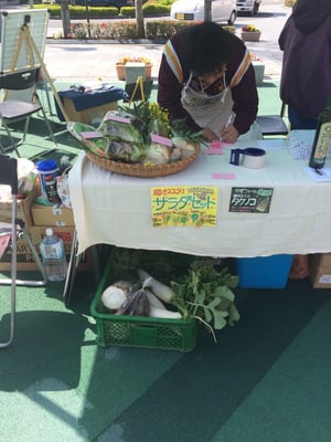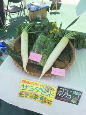 そんななか、「里山ココマルシェ」では、ナノ発電所やSunPad10での携帯充電サービス、ソーラークッカー「かるぴか」を使ってポップコーンの実演、注目を浴びるココナッツオイル、オリーブ、えごま油などのオイル等の販売を手がけました。目玉はなんと言っても里山事業でも連携している「里山農園やぎファーム」のタケノコ、サラダセット、大根などの旬な野菜です