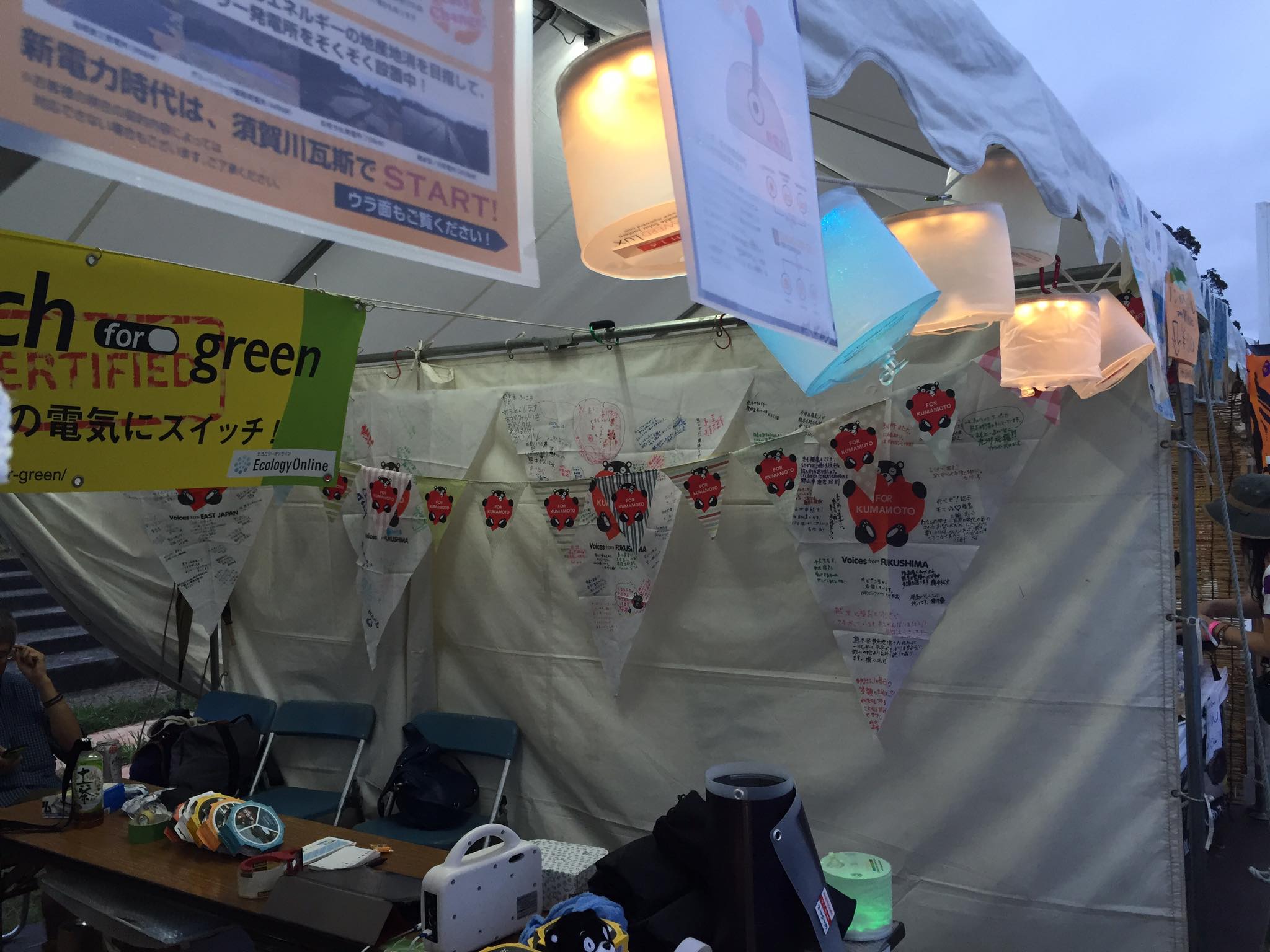 このブースは、6月14日から20日にわたって当法人が実施した【Green Power for くまもと】の活動にご協力いただいた同イベントから、熊本で行った「にほんのうた熊本キャラバン」の報告と、福島、熊本の復興を支援する物販ブースを担当しませんかと声をかけられたところからスタートしました。