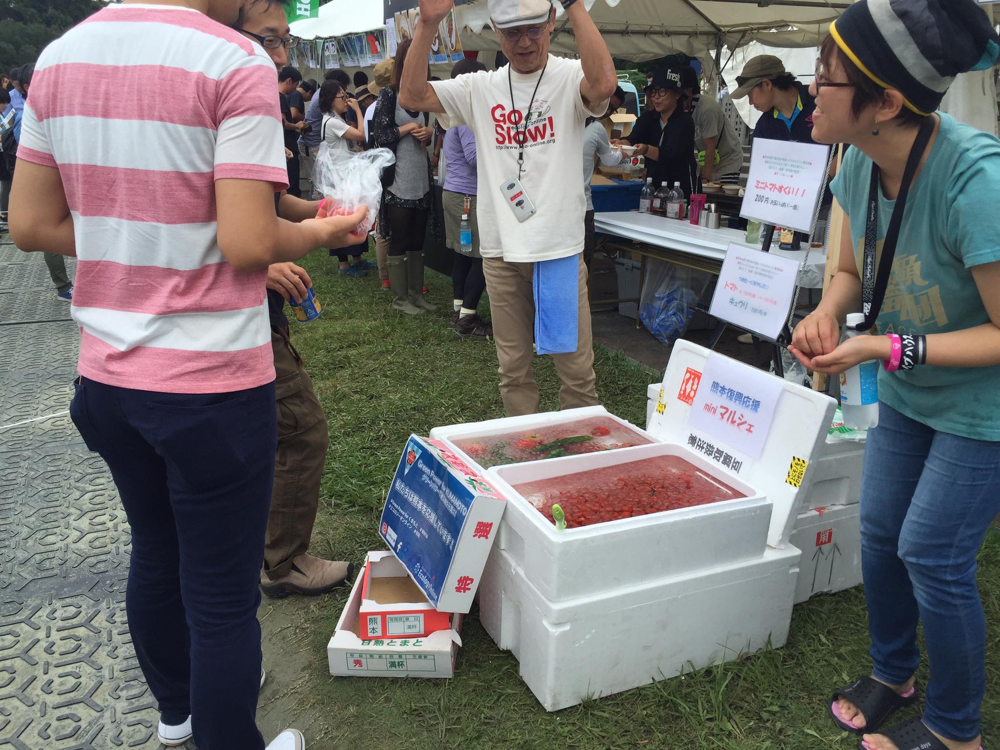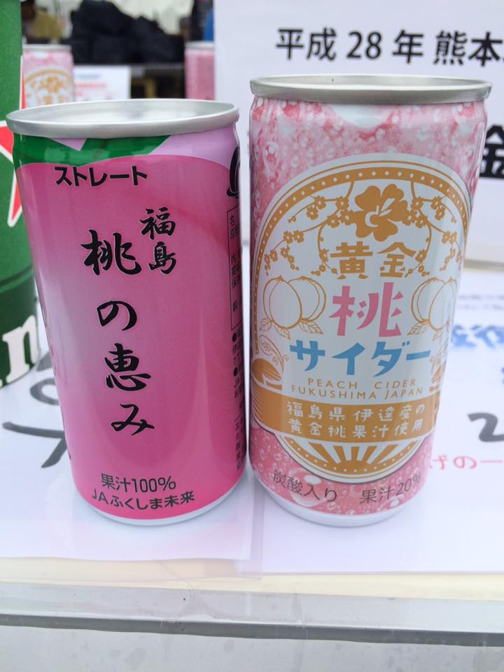 当日は、このプロジェクトを手がけた福島、関東、関西の仲間が集まり、「にほんのうた熊本キャラバン」で寄贈した自然エネルギー機器の展示・販売や、八代亜紀さんの復興ライブの舞台となったソーラーパワートラックの模型を展示。熊本からは行き場を失った野菜も届けられ、益城町の子どもたちの給食費に寄付される益城町復興ソーダとサイダーを送ってもらって販売しました。福島からは桃のジュースなどを送ってもらい、フェス参加者のみなさんののどを潤しました。