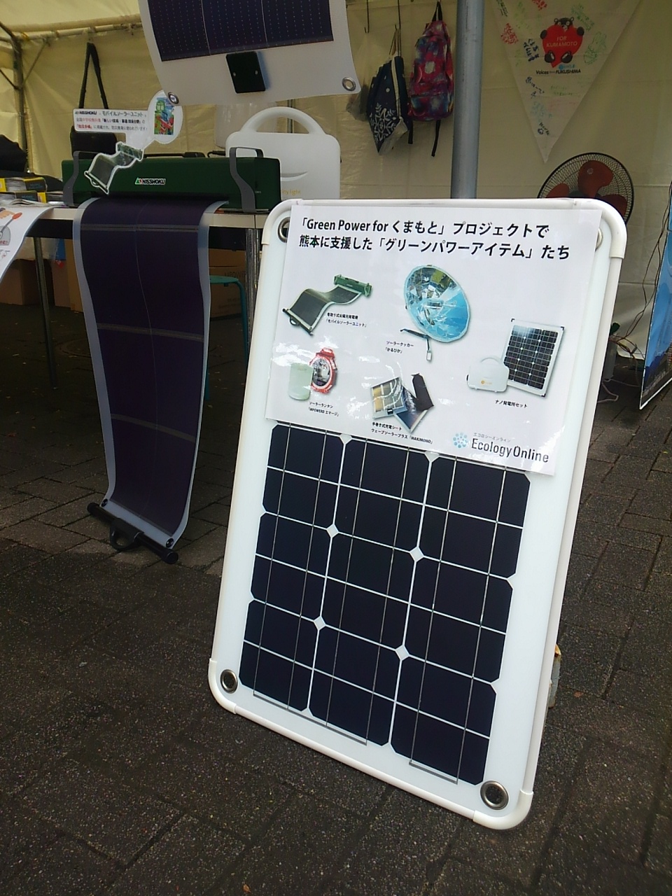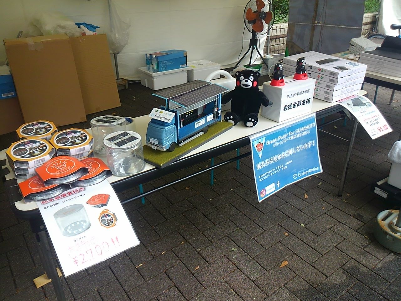 ソーラーシティ・ジャパンのブースでは、福島・熊本復興支援活動の紹介をメインに、益城復興サイダー・炭酸水や、太陽光発電グッズ、自転車発電体験などを展示・販売しました。