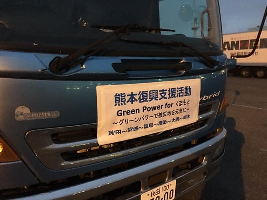再生可能エネルギーを手がける全国の仲間たちと共に、太陽光発電と蓄電池を装備するソーラーパワートラックを活用した熊本支援活動を6月14日から20日にわたって実施しました。秋田を出発し、宮城、福島、横浜、大阪を周り各所で寄付していただいた支援物資を満載し大分、熊本へ届けました。熊本では「にほんのうた実行委員会」協力のもと、現地の電気を使わないソーラーパワートラックステージで、八代亜紀さんとくまモンが共演するイベントを実施しました。