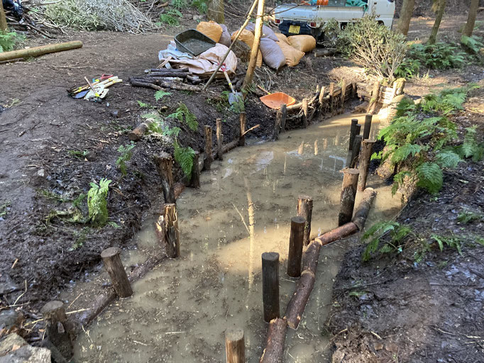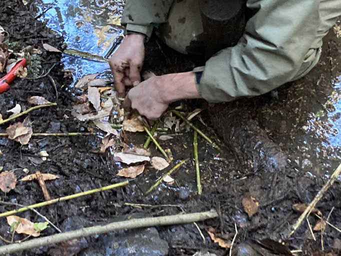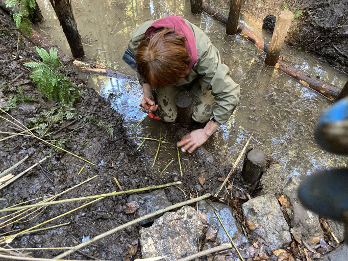 作った当時、坂田先生の指導が行き届かなかったのか、しっかりと枝が組めておらず、ただ雑に木の棒が刺してある状況だったため、腐敗した泥を除去、深々と刺さった木の棒を抜いてから再度しがらを組み始めました。