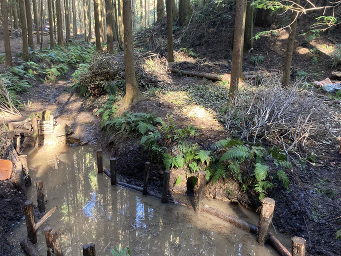 今回は、落ち葉が腐り、腐敗臭を放っていたしがらの修復から。