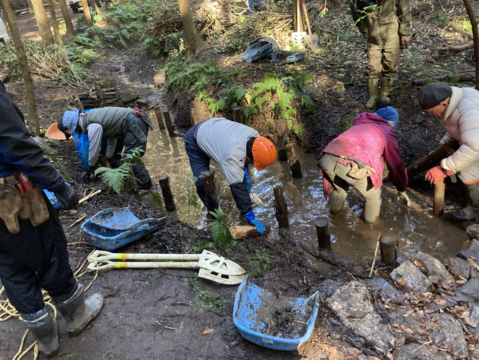 寒い中で冷たい水中で枝を組み、落ち葉を詰めてゆく皆さんの手にも力が入ります。