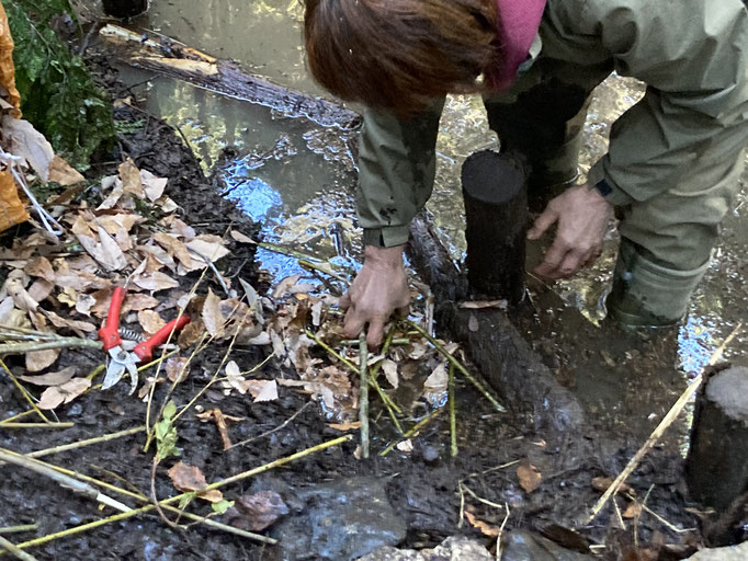 雨の流入を落ち葉で抑え、微生物が繫殖しやすい場所にすることを念頭に置いて木の枝でしがらを組んでいく参加者の皆さん。