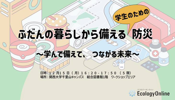 12月15日(月)、関西大学千里山キャンパス総合図書館1階ワークショップエリアにおいて、関西大学ピア・コミュニティ(KUSP)主催の防災セミナーの講師をエコロジーオンラインが担当させていただきました。