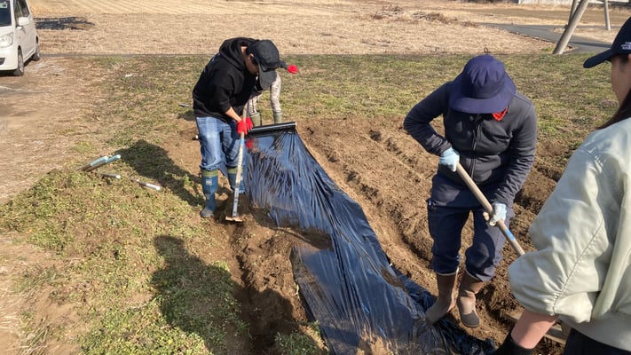 畝ができたらマルチを張ります。