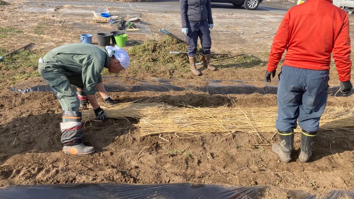 ③種イモを植え付け、上から藁を敷く