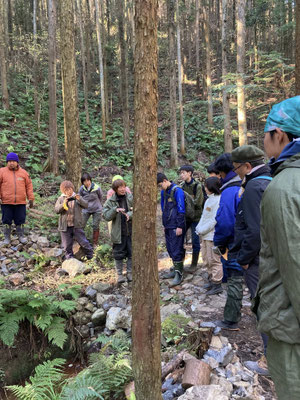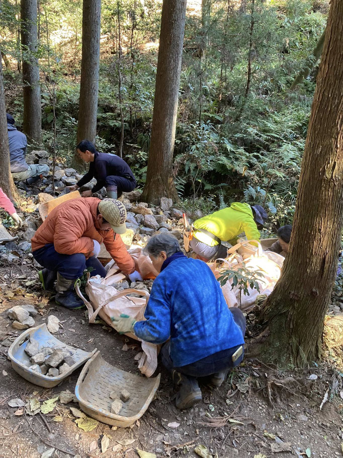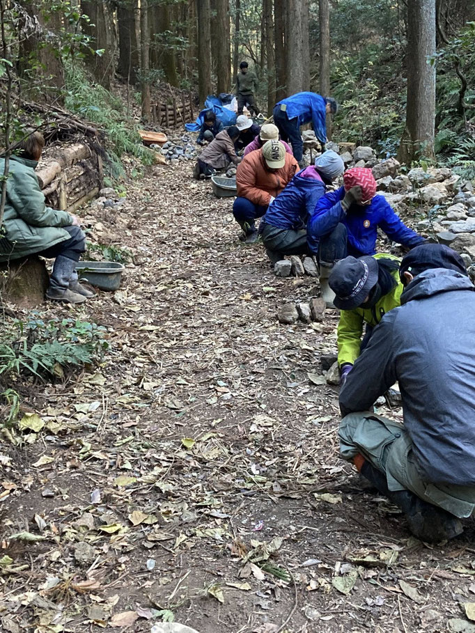 その後、実際の澤で坂田さんの指導を受けながら石頭(せっとう)を使ってゆっくりじっくり石積みしていきます。🪨