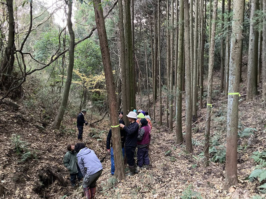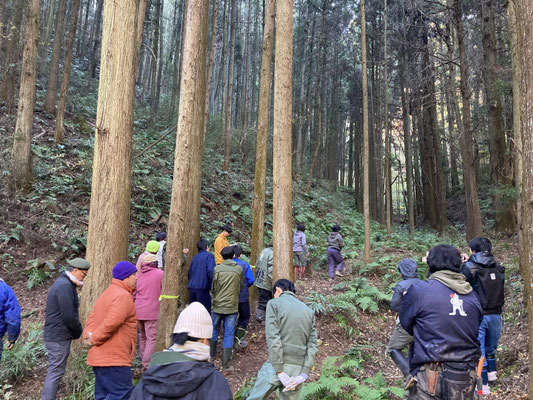 山に入って、陽の当たり方、風の流れ、木や土の様子などを感じながら、伐採した方がよい木を選んでいただきます。