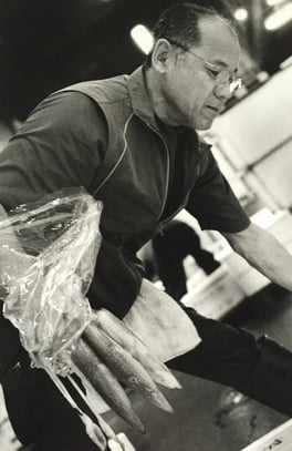 『東日本大震災は自分が市場へ戻るクルマの中で起きました。交差点で止まっていると、クルマが大きく揺れ、電柱が揺れ電線が大きく波打っている。「これはただ事ではない!」と、あわてて市場に戻ると、横浜港でも津波注意報が出ていました。解除されるまでは市場に残りその後帰路へ。しかし国道は大渋滞!鉄道が止まっているので多くに人々が家路に向けて歩いていました。途中で水と食料を買い込んで自宅へたどり着いた時にはすっかり夜。そしてテレビで津波の被害の大きさを知ることになりました。地震、津波、原発事故を目の当たりにして「国家の大参事だ」と感じました。なんと次の日からはぱったりとサカナの注文が入らなくなった。市場での仕事はしばらくお手上げ状態が続きました』