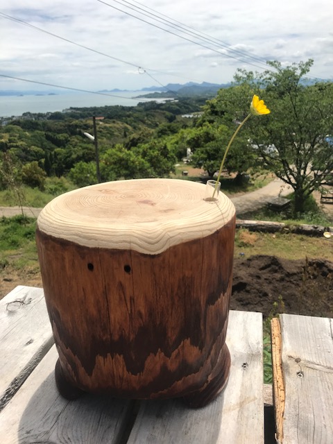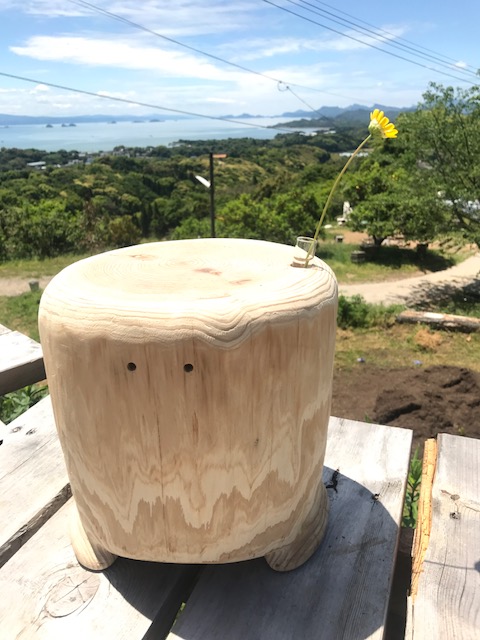 この切り株イスをつくってくれるのは障がい者施設の*****。このイスが売れることで間伐材の活用方法が増え、購入していただくことで森の整備事業に資金が循環し、さらに障がいをもった方たちのお仕事の支援につながります。