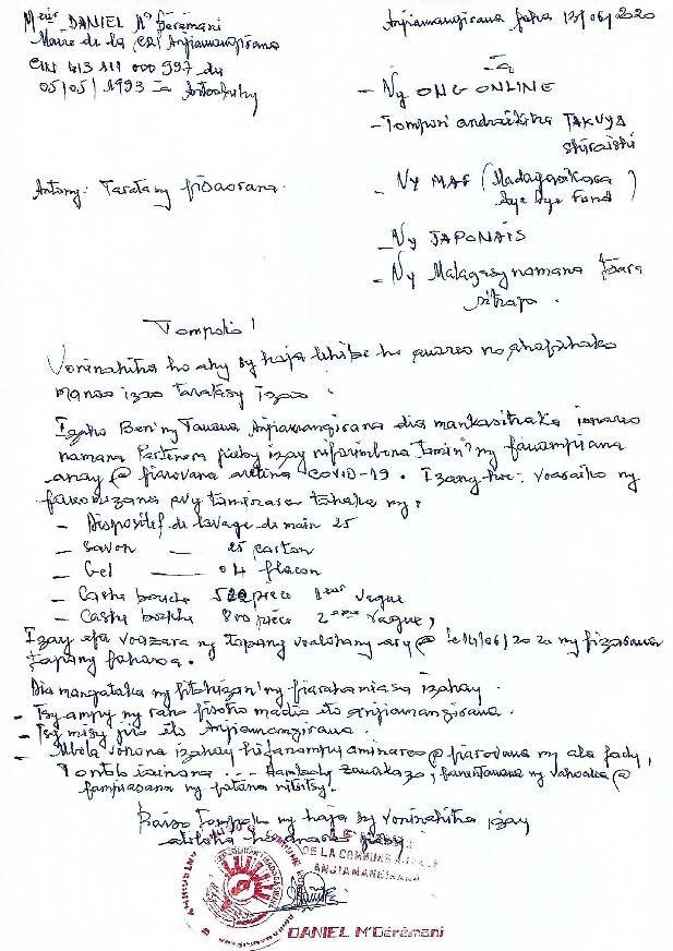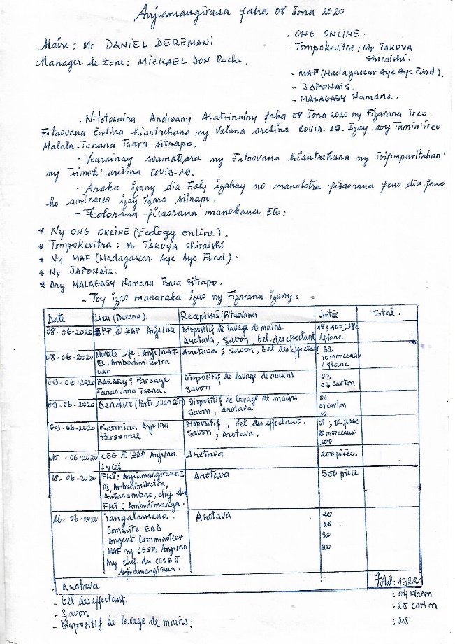 マダガスカル人の環境NGO、Madagascar Aye-aye Fund(MAF)を通じて、アンジアマンギーラナ市のダニエル市長へ資金や物資(石鹸750個、消毒ジェル500mlが4本、手洗い用タンク25個)を送りました。マスク1322枚を現地で調達したことで、地元経済にも貢献しました。