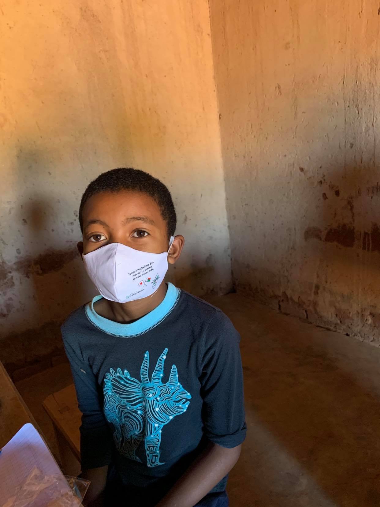 今回、配布用に準備したマスクにはマダガスカル政府のコロナ対策標語「私は責任をもって、自身をそして他の人を守る」という意味のマダガスカル語、そして日マ両国の国旗、エコロジーオンラインとマダガスカル・みらいのロゴ入りで、一枚づつ密封され、しかもデザインもスマートとあってどこでもなかなか人気です。