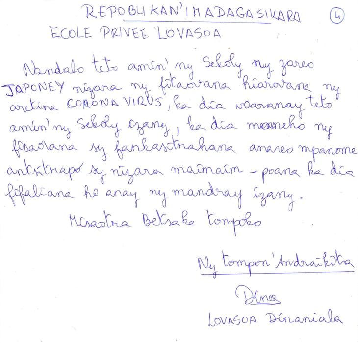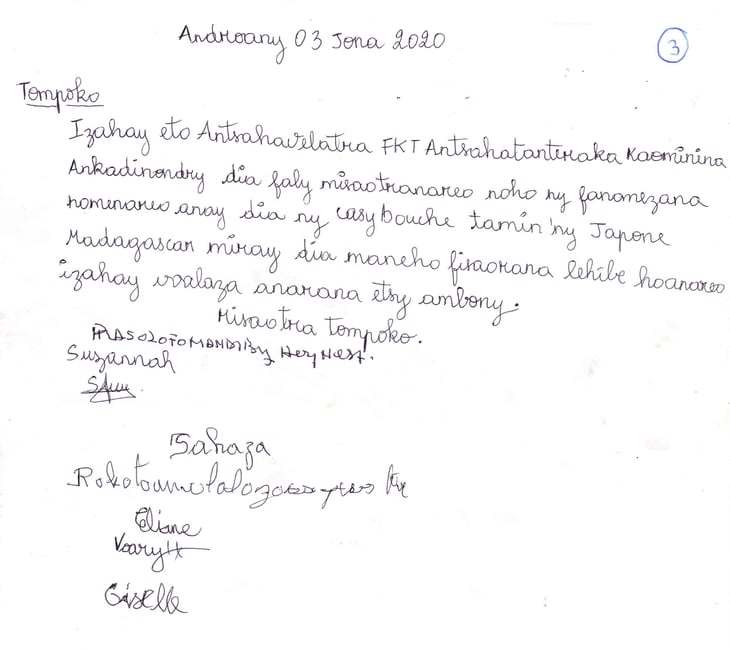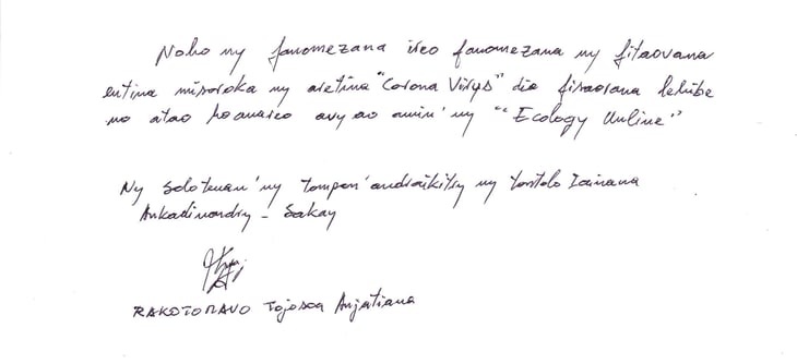拝啓、私たち「アンカディノンディー サカイ共同体、アンサカタンテナハ、アサカベロチャ村」一同はマスクなどを寄付戴き日本の皆さん及びマダガスカル・みらいに感謝いたします。