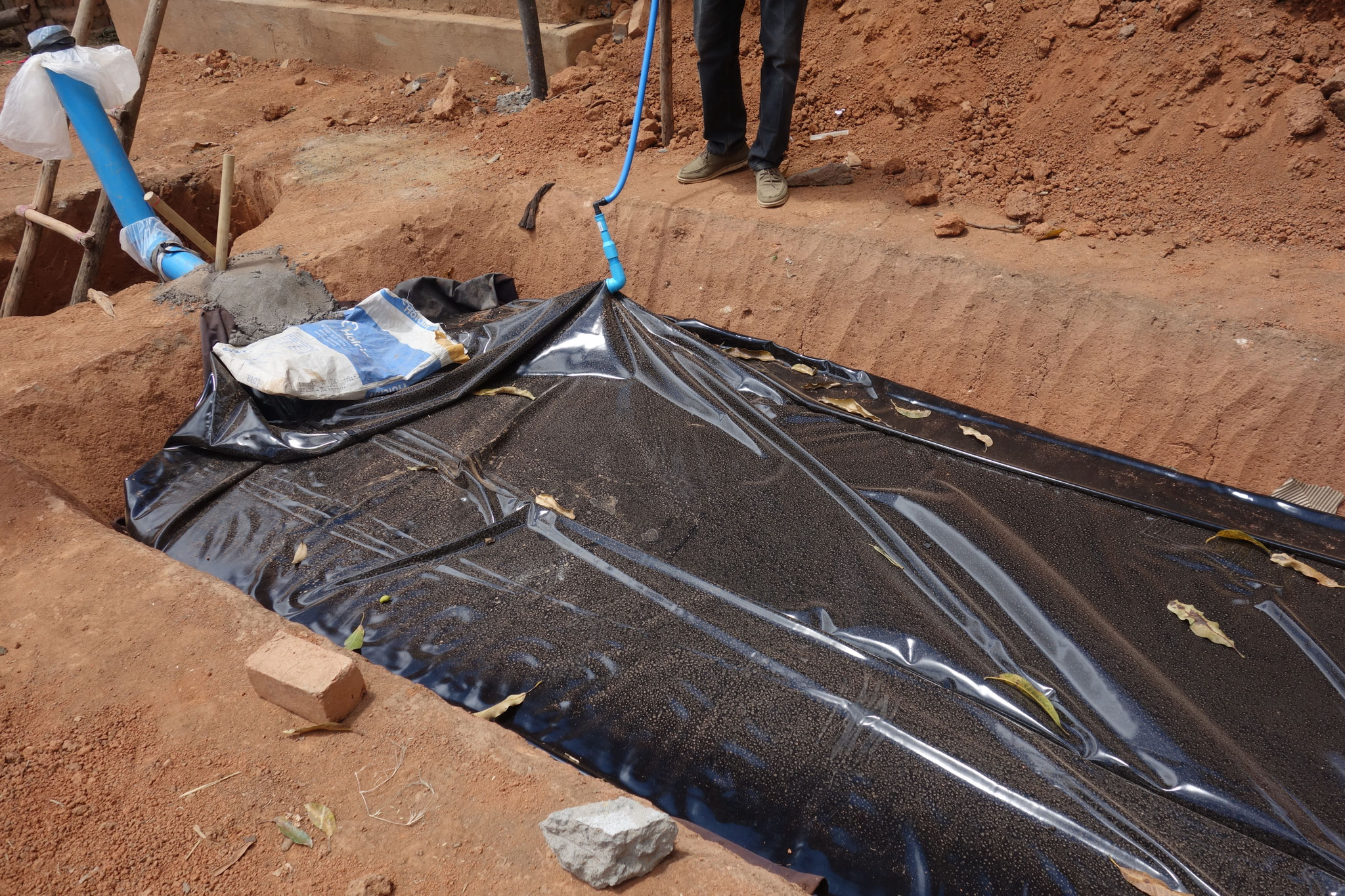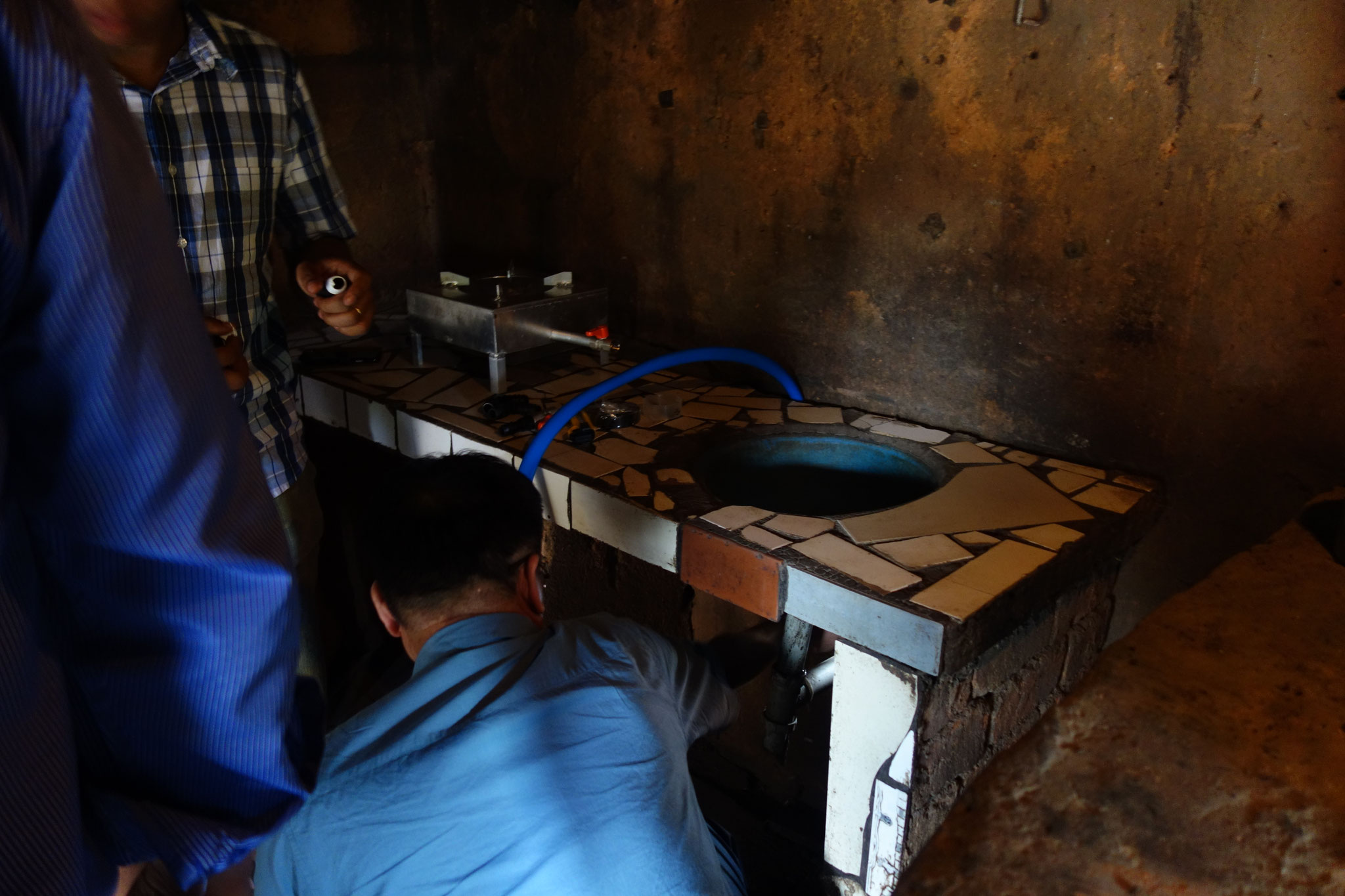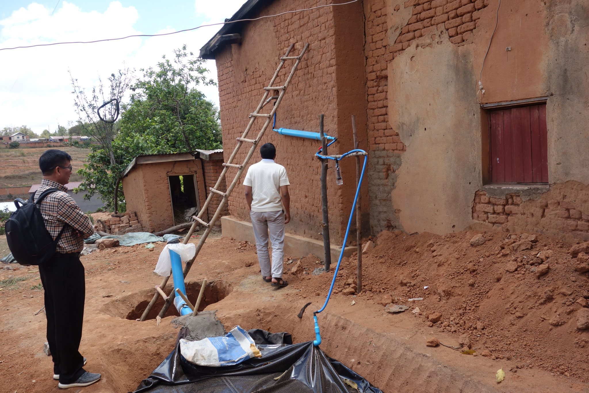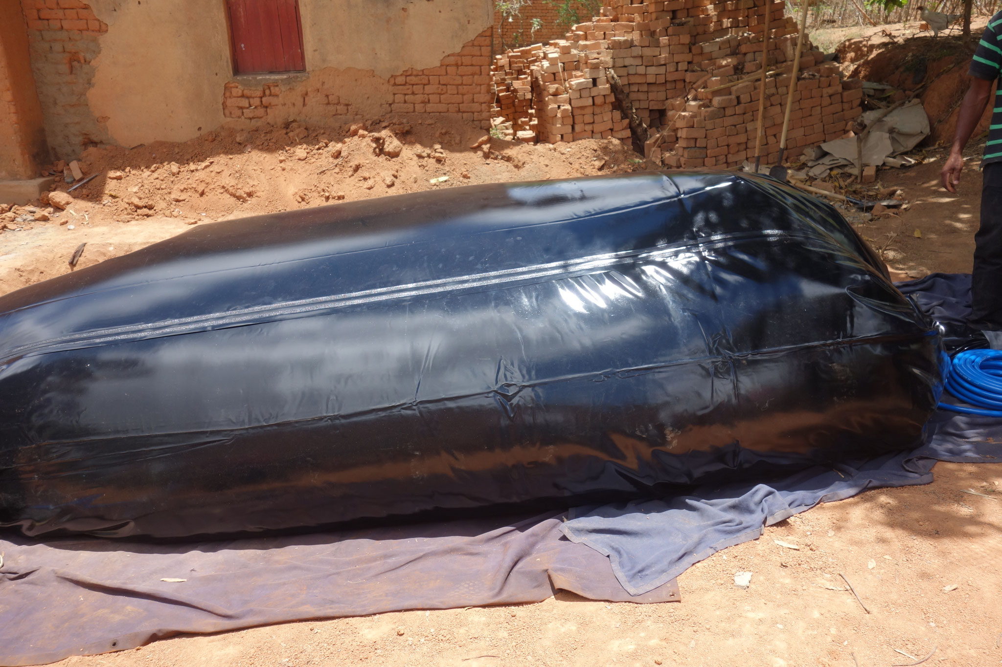 シンポジウムに2日目はバイオガスプラント設置のワークショップです。マダガスカル首都アンタナナリボ近郊のイラフィにて、バイオガス・ダイジェスターの設置デモンストレーションを行いました。前日のシンポジウムにも参加したロバソア小学校の校長や教員、大学の研究者たちが見守るなか、タイで調達した資材を使って、サッチョン教授とフェトラ博士の指導の下、マダガスカルミライのスタッフがダイジェスターを設置しました。ダイジェスターを設置している間、一部のメンバーは、JICAのコメ増産プロジェクトの専門家チームの事務所を訪問。当バイオガス事業に関する意見交換を行いました。