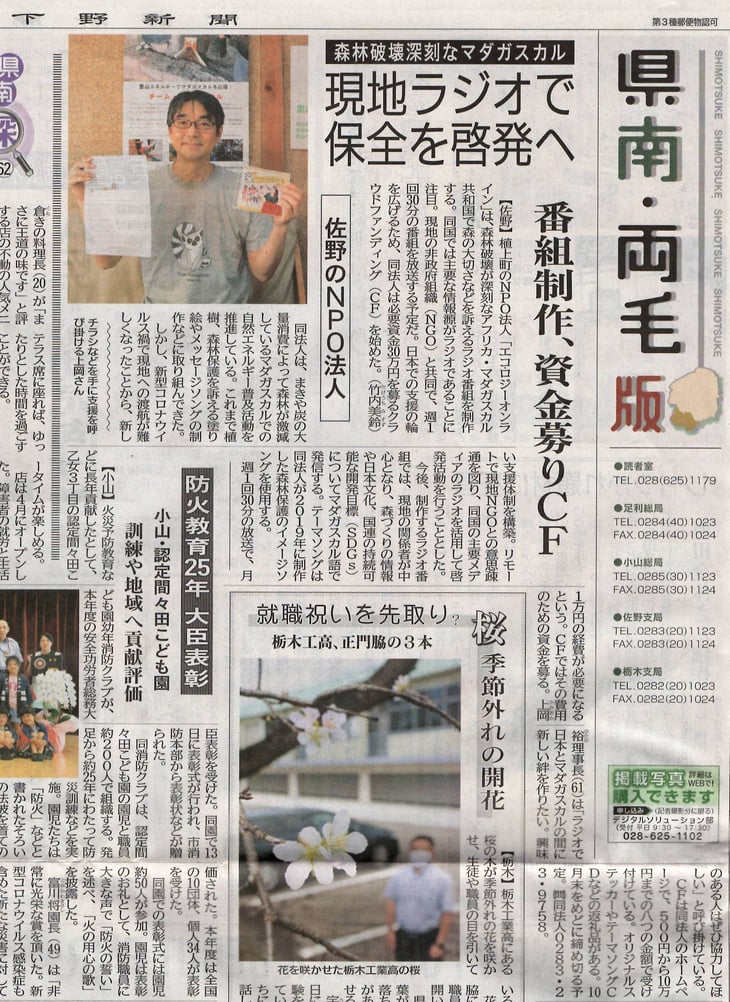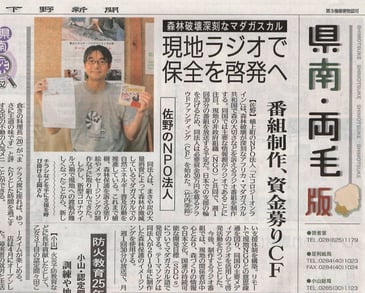 2021年9月18日、下野新聞にマダガスカルでのラジオ番組「ラジオサカイ」のクラウドファンディングの記事が掲載されました。