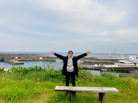三宅島の港に到着したエコロジーオンライン一同を歓迎してくれたのはザトウクジラのクラウドファンディングの中心人物である沖山雄一氏。