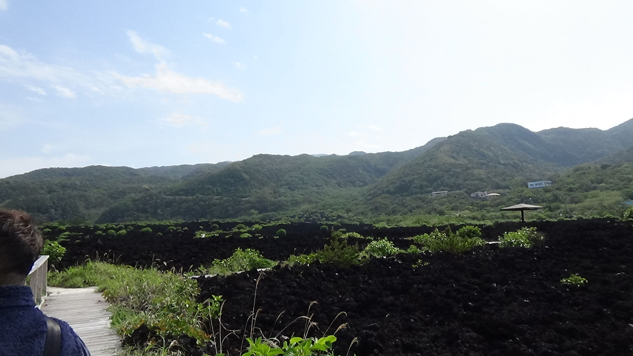 遊歩道からうかがえる黒い溶岩のはるか8メートル下に当時の住宅跡が埋まっているそうです。