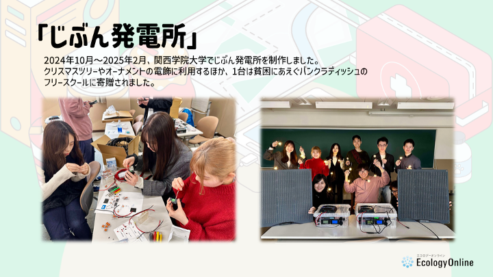 関西学院大学(兵庫県西宮市、学長:森康俊)国際学部の授業「グローバルイッシューB」(担当教員:定藤繁樹 関西学院大学名誉教授)とNPO法人エコロジーオンライン(栃木県佐野市、理事長:上岡裕)は、可搬な小型の太陽光発電装置「じぶん発電所」を製作しました。製作した「じぶん発電所」は、12月10日(火)から12月23日(月)の間、関西学院大学G号館3階エントランスに飾られるクリスマスオーナメントのLEDイルミネーションの電気として利用されます。個人でエコフレンドリーなエネルギーを作り、CO2排出量の削減を通じて、環境保全に寄与できることを学生や教職員に周知する取り組みです。