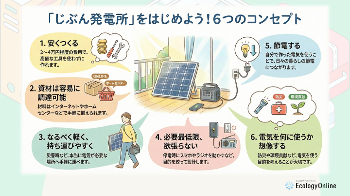エコロジーオンラインが主導する「じぶん発電所」は、ベランダや窓辺など限られたスペースでも、身近な資材で発電を始められることをコンセプトにしています。
