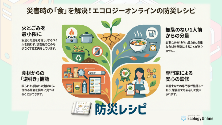 エコロジーオンラインが提案する未来共存型防災の具体的な行動は、「エネルギーの自立」と「環境貢献」を両立させます。
