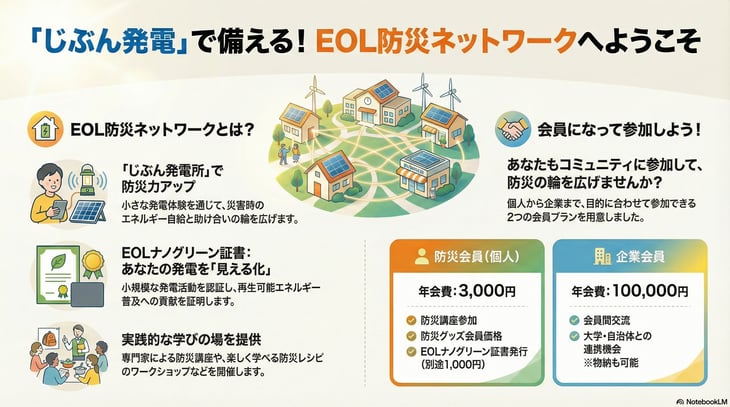 革新的な仕組み: 「じぶん発電所」による自立的な備えに加え、EOL防災ネットワークに加入することで、あなたの防災行動がそのまま再生可能エネルギーの普及に貢献します。