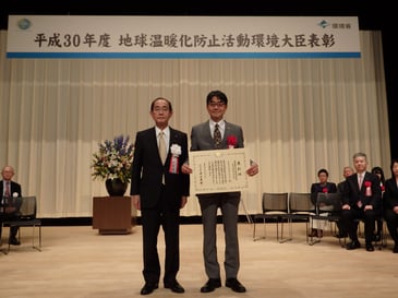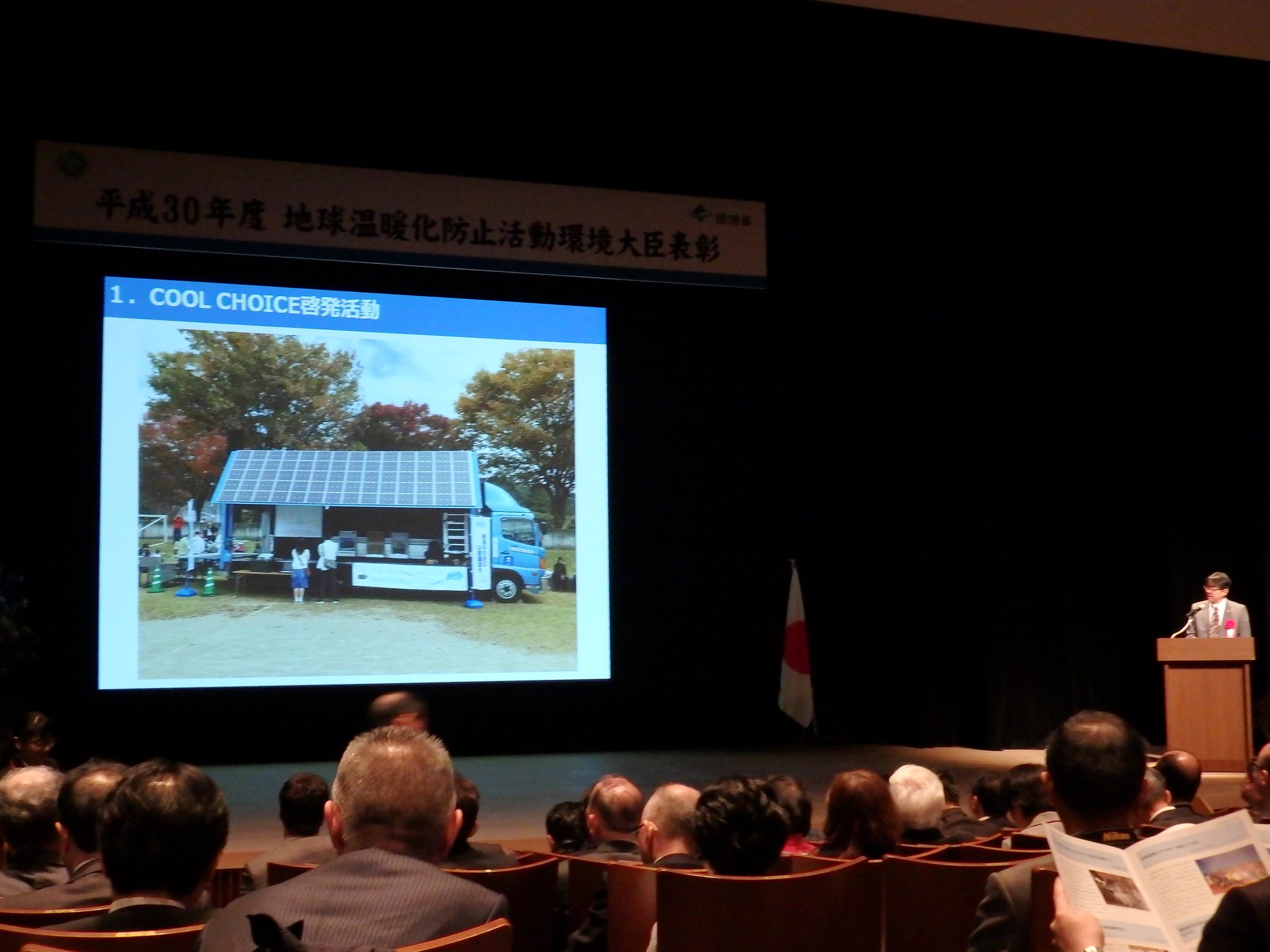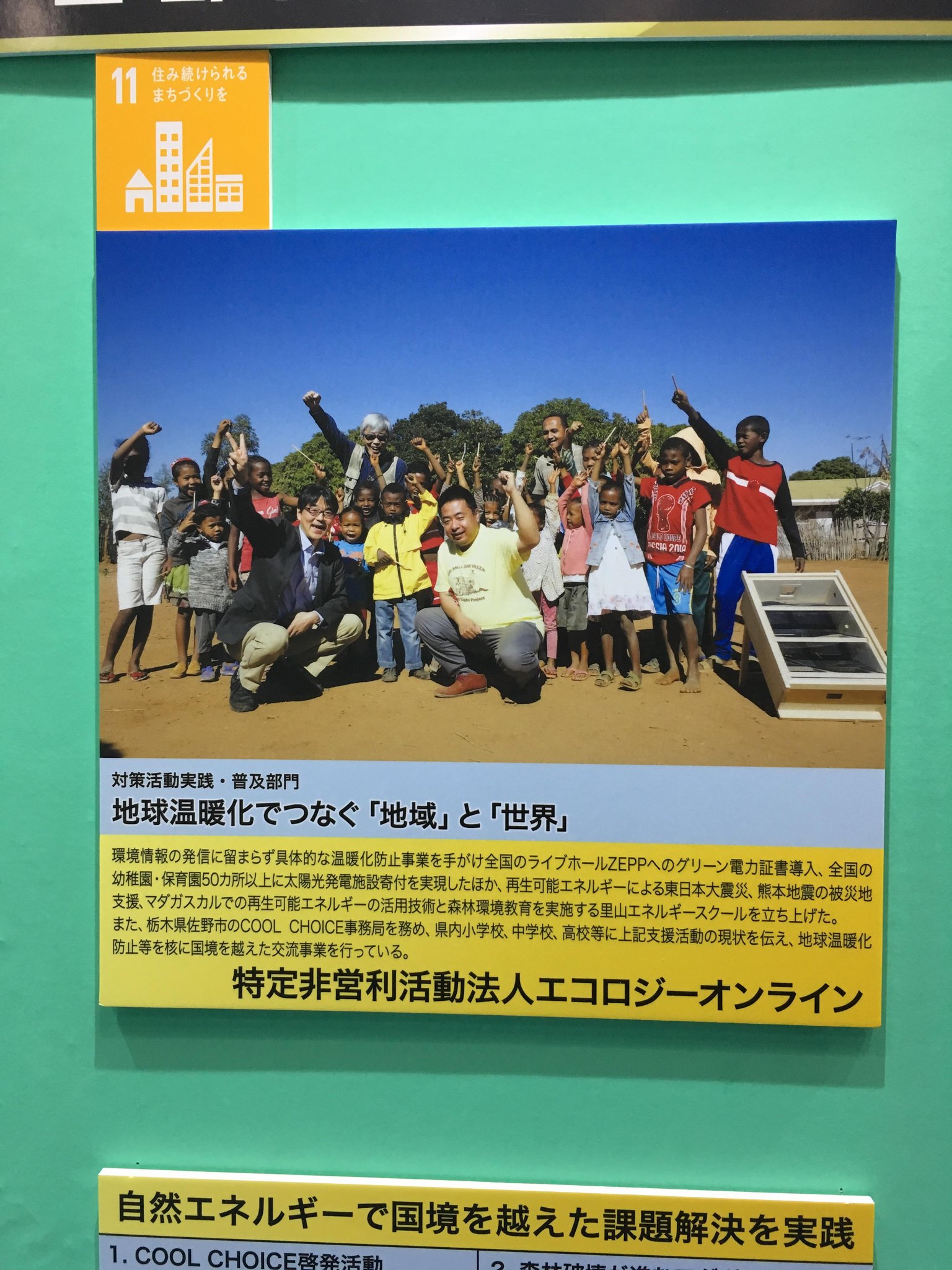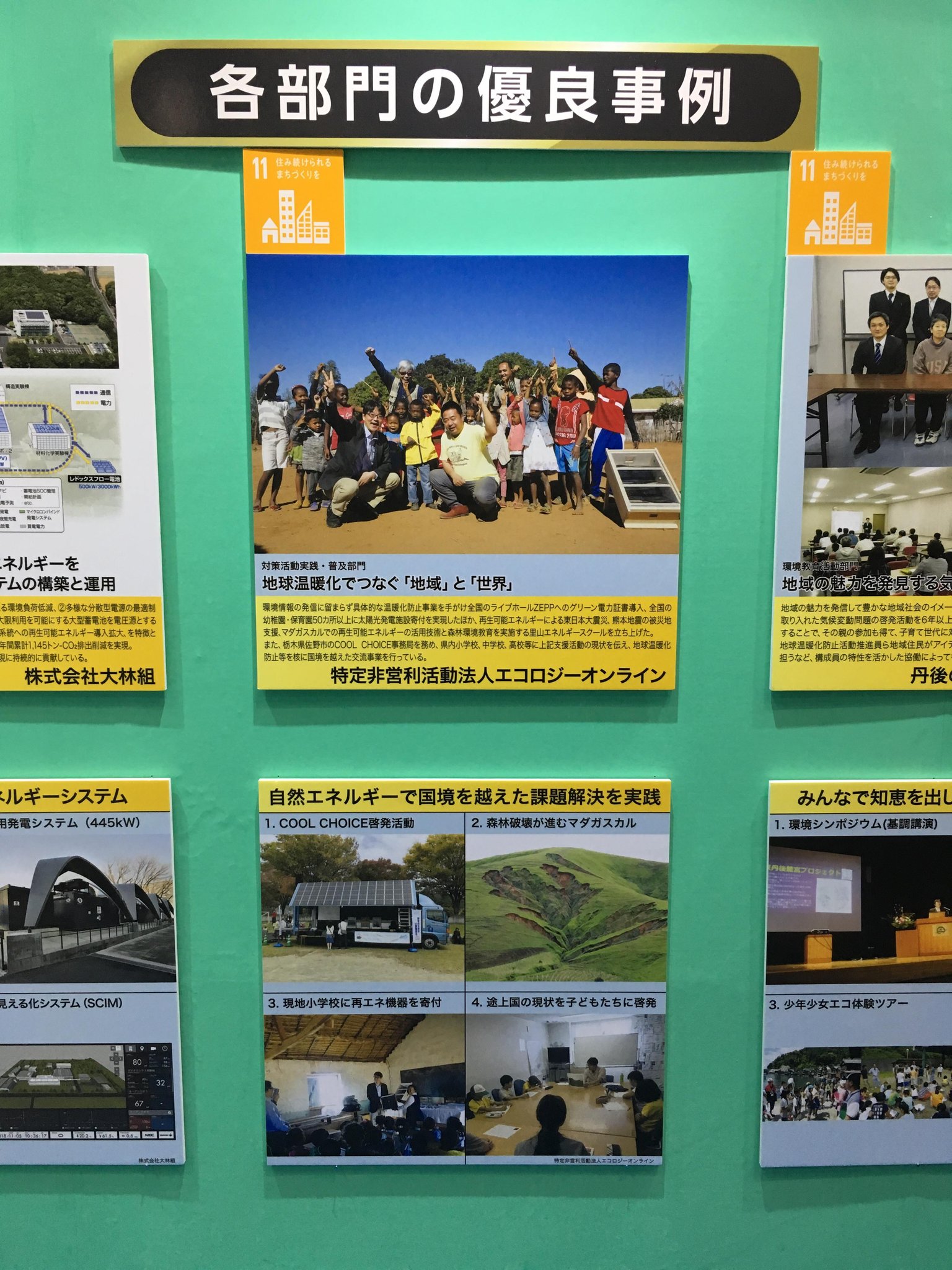 地球温暖化をテーマに様々な社会課題の同時解決を目指すSDGsを先んじて取り組んだことが評価され、「対策活動実践・普及部門」の代表的な取り組みとして、12/6~12/8のスケジュールで開催される「エコプロ2018」の環境大臣表彰のブースでパネル展示、本年度の環境大臣賞の代表例として来年度も紹介されることになっています。