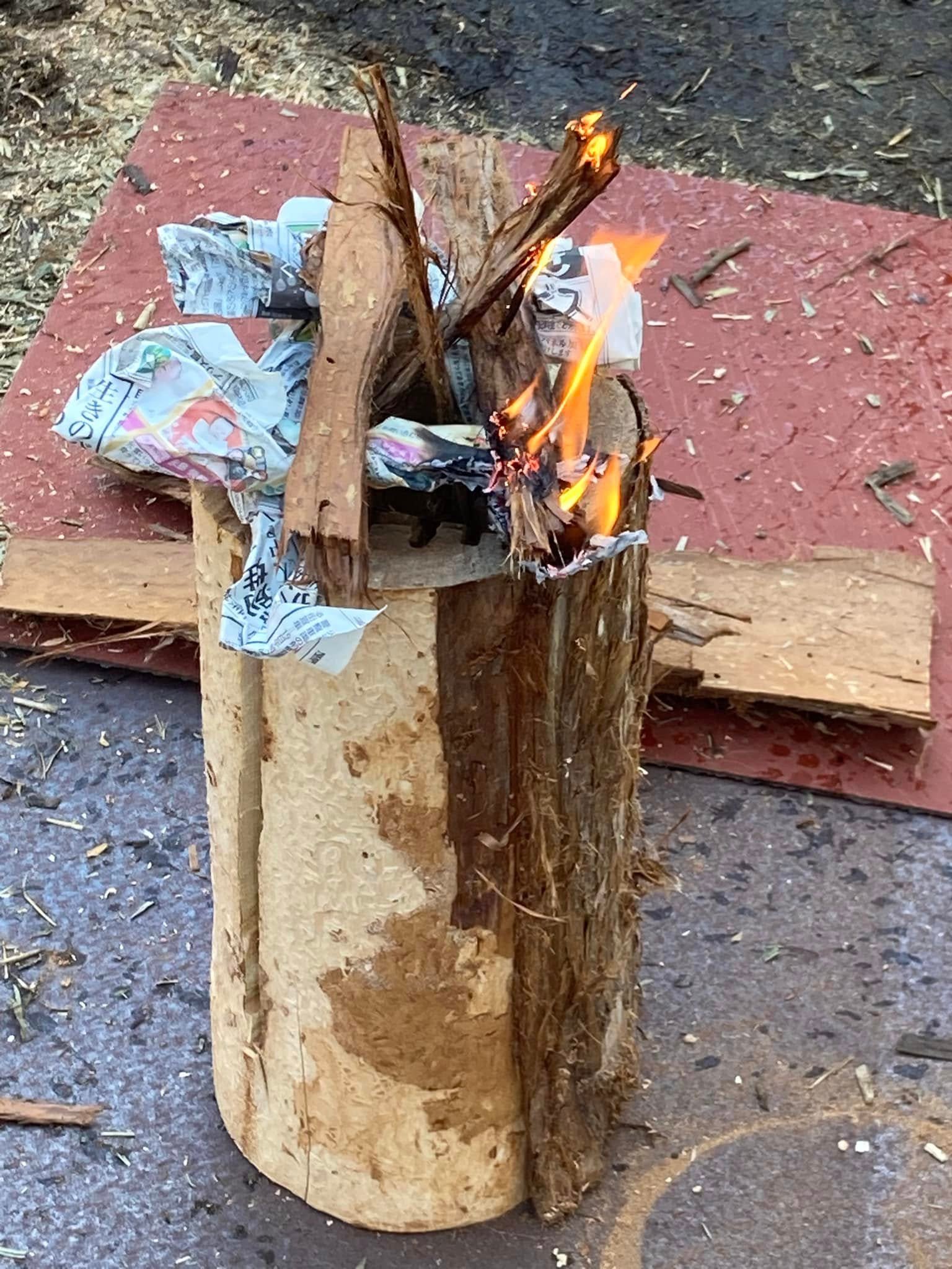森の手入れにもなり、里山を楽しみ、何かあった時には防災コンロになるログファイヤー。余頃先生、貴重な体験をありがとうございました。