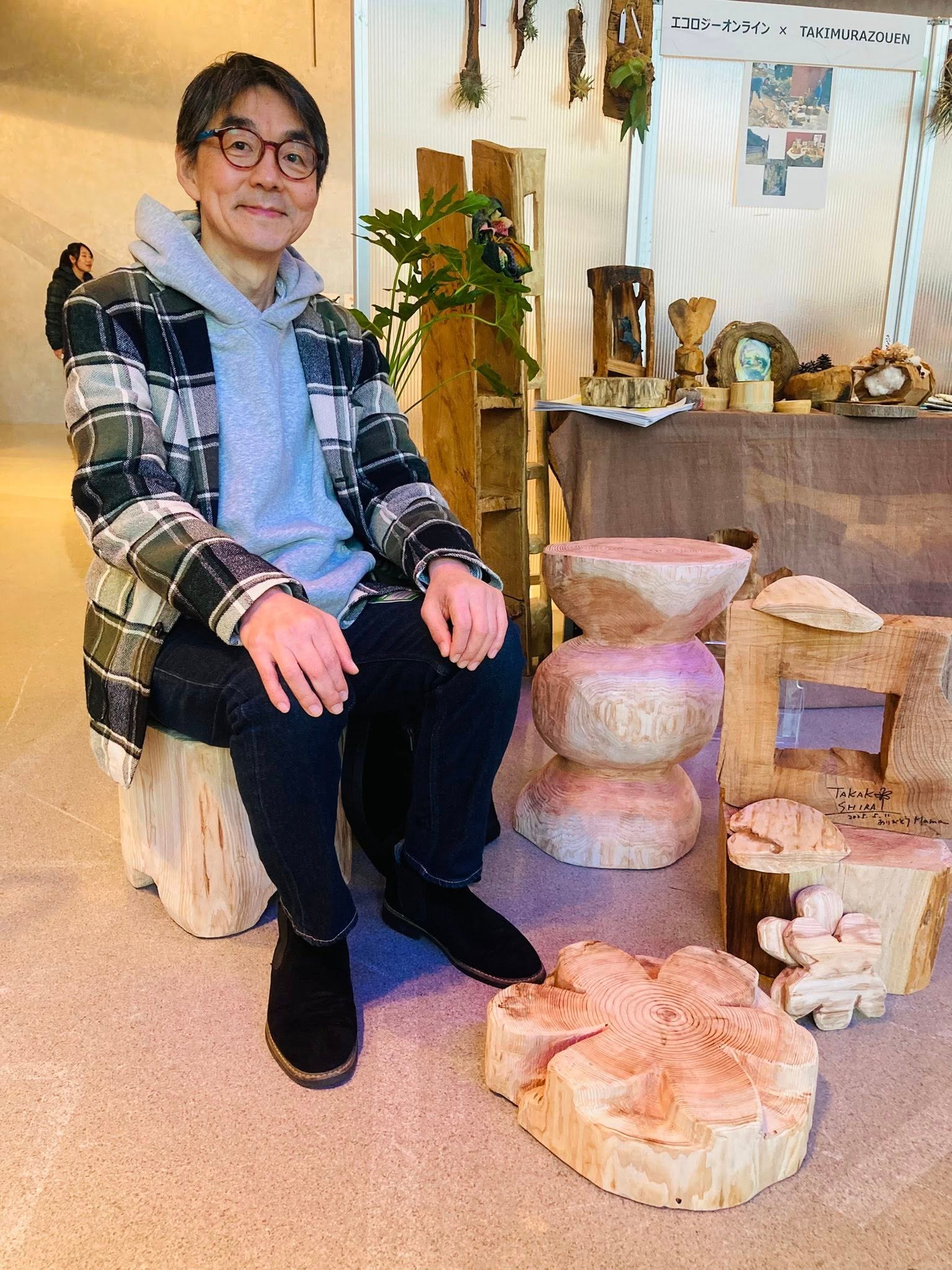 会場はKT Zepp Yokohama。瀧村造園の江原さんご夫妻とともに里山再生のために選別伐採された栃木県佐野市・丸岳の杉を使ったスツールや小さな椅子、伐採木アートを展示しました。