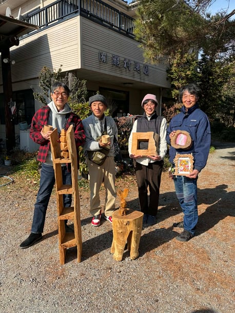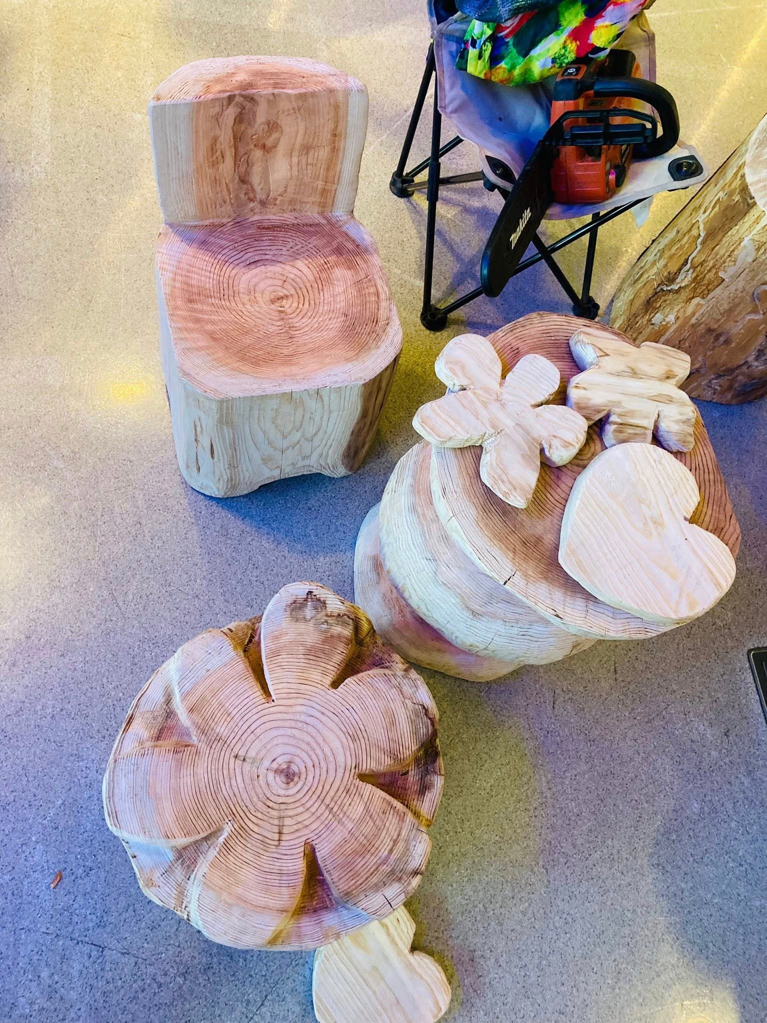 これらの作品は江原さんがチェーンソーで製作したものですが、生物多様性の回復と人のつながりを大切にする里山再生の現場から生まれました。伐採された木を「無駄にしない」のではなく、「意味を持って活かしきる」ことを大切にしています。
