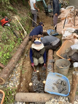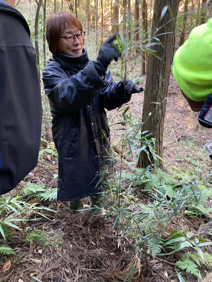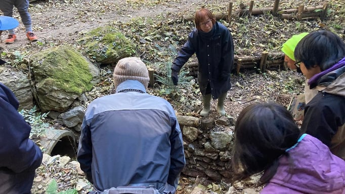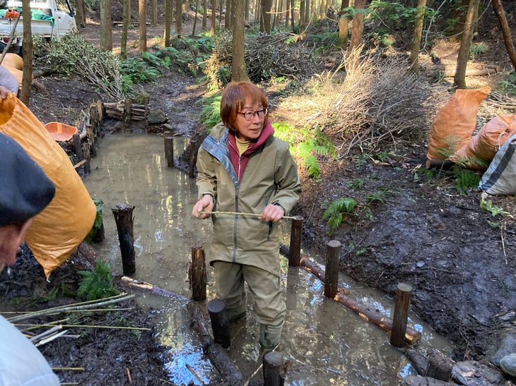 本年1月~3月、環境改善をテーマにしたイベントやワークショップで全国各地を駆け回り、地球サミットなど国際会議にも継続的に参加している坂田昌子先生に延べ8日間も足を運んでいただきました。坂田先生に山の地形や特性を読み解いてもらい、生態系豊かな里山を再生していくための先人の知恵に学んだ伝統的手法による沢の手入れを始めました。