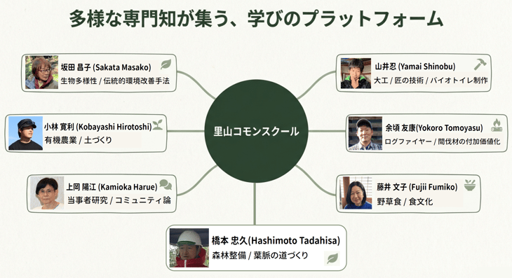 里山コモンスクールは、座学だけではなく、実際に見て、体験し、多様な専門家と共に学ぶためのプラットフォームです。