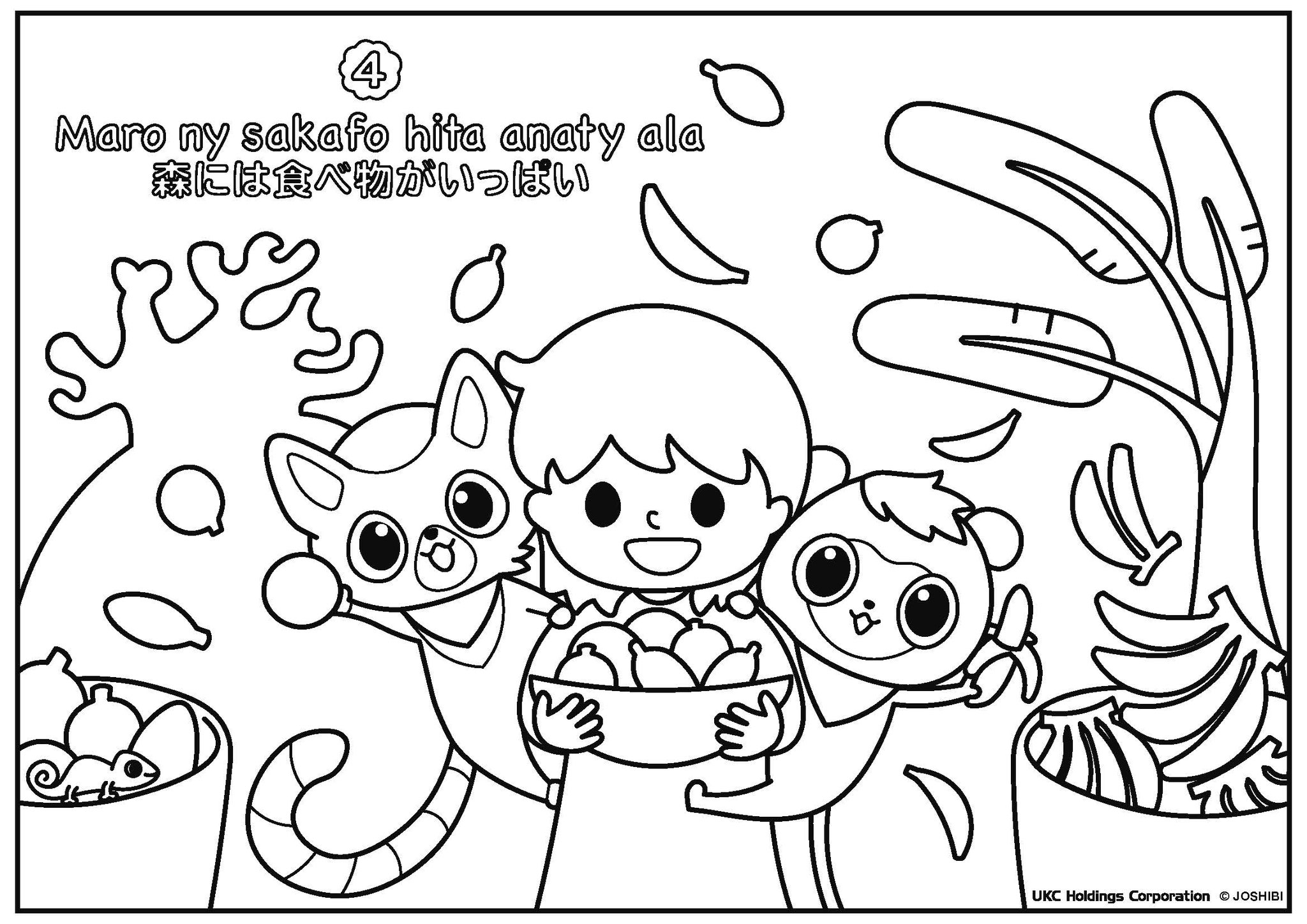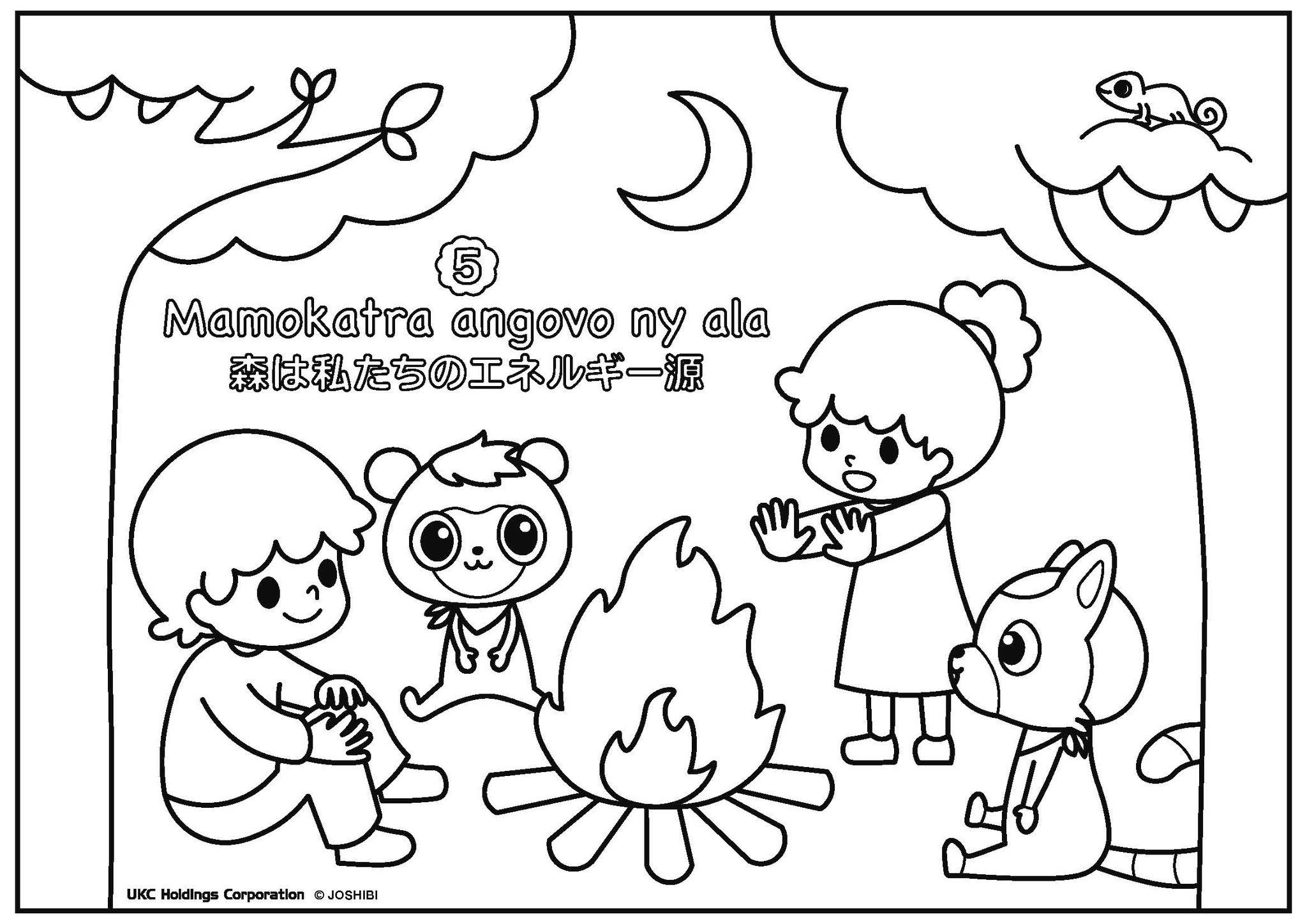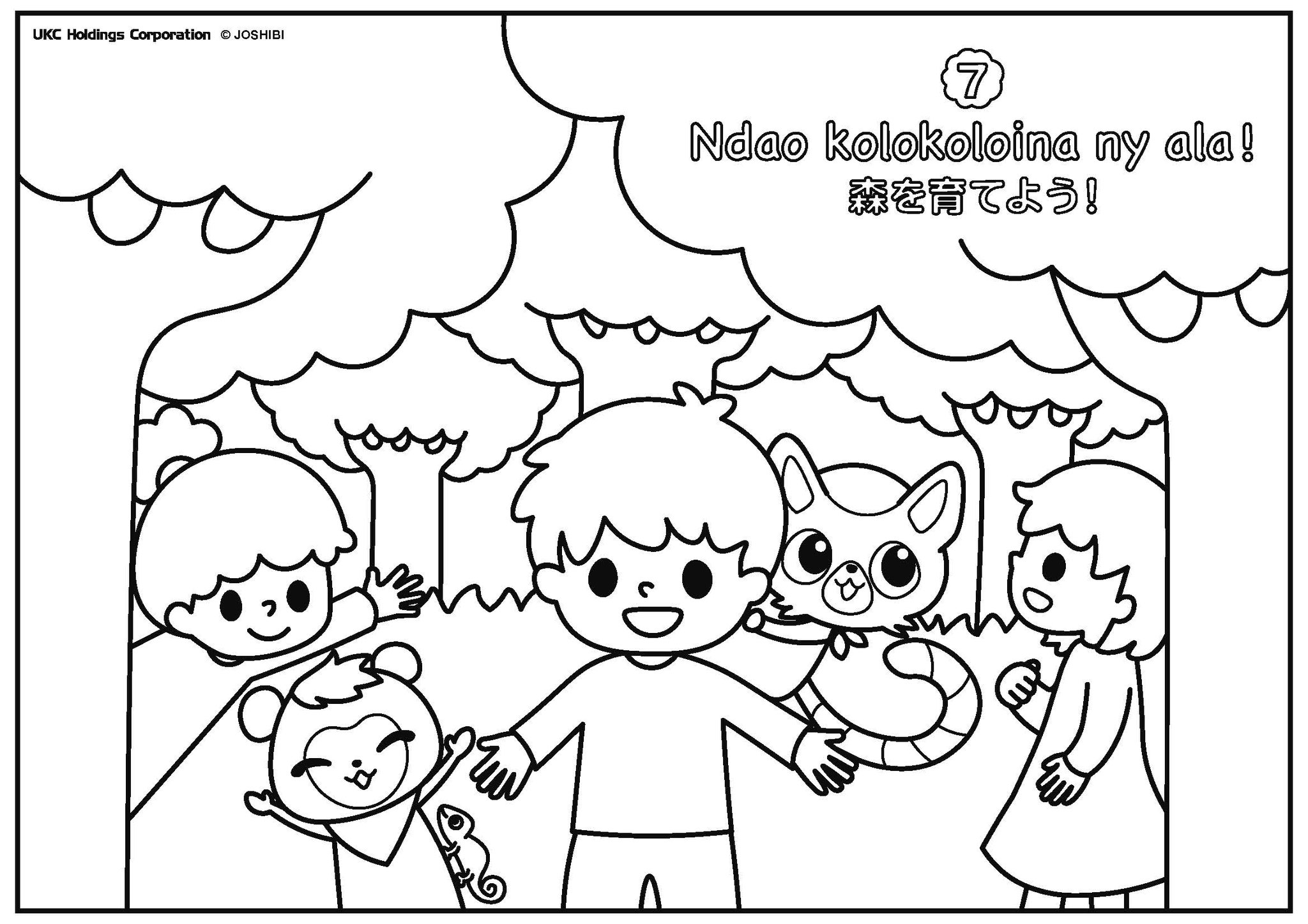植物・動物・人が描かれたぬり絵は子どもたちに大人気。森林破壊により影響を受けるのは人間だけではありません。動物も同じです。住処が奪われることを考えると、人間よりも動物の方が直接的な影響を受けているかもしれません。子ども達が、ぬり絵を楽しみ、歌って踊り、森や動物に親しみを抱くことにより、森を守ろうという力になることを願います。