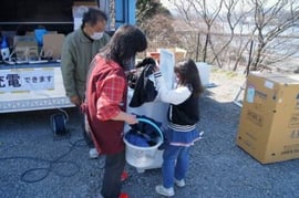 被災地支援4日目。朝早くからソーラーパワートラックの周りは、(我々が持ち込んだ)洗濯機の脱水機能を利用する人でにぎわっています。濡れた洗濯物はいくら手で絞っても、十分に水が切れないため、なかなか乾かないのだとか。まだまだ水も冷たく、洗濯はかなりの重労働です。しかし、脱水機で絞った洗濯物の軽さにはみな驚いており、電力のありがたさを改めて実感します。