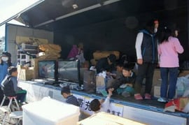 午前11時半、自衛隊の支援物資が到着。本日の物資は、水、カップラーメン、牛乳、オムツ、男性用の衣類。物資の積み下ろしを行います。そして今日もうれしい知らせが! 石巻市役所にお願いしていた大型の発電機が設置されたのです。これで我々のソーラートラックがこの避難所を発ってからも、電気のある生活を続けることができます。